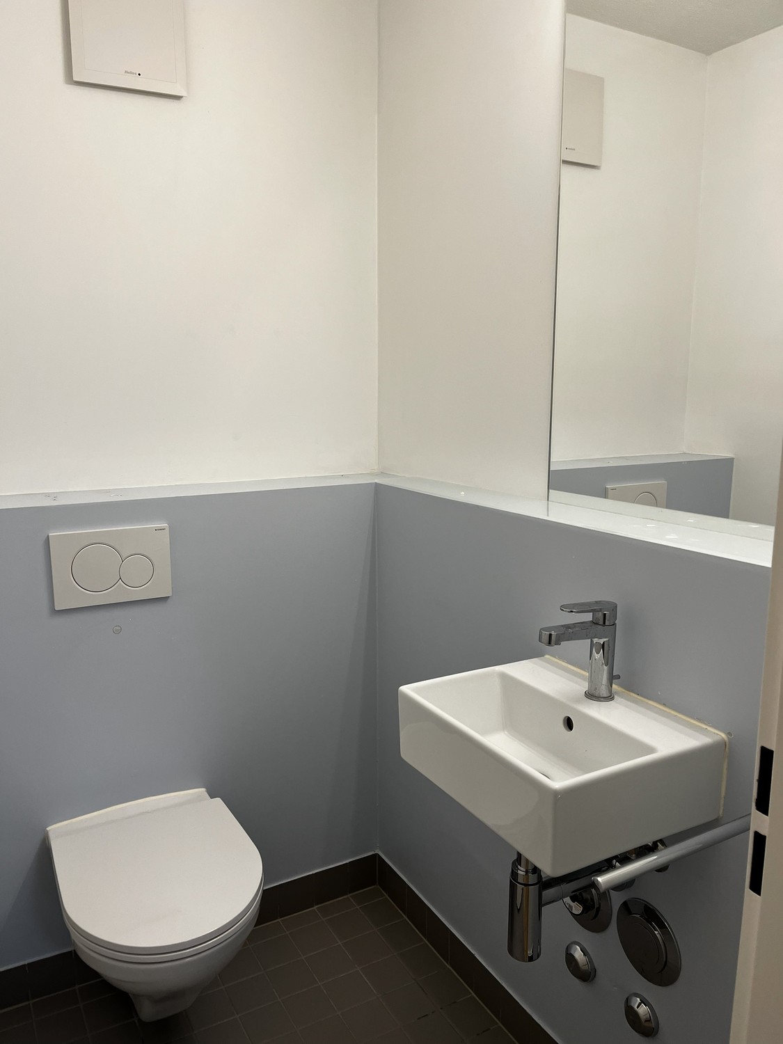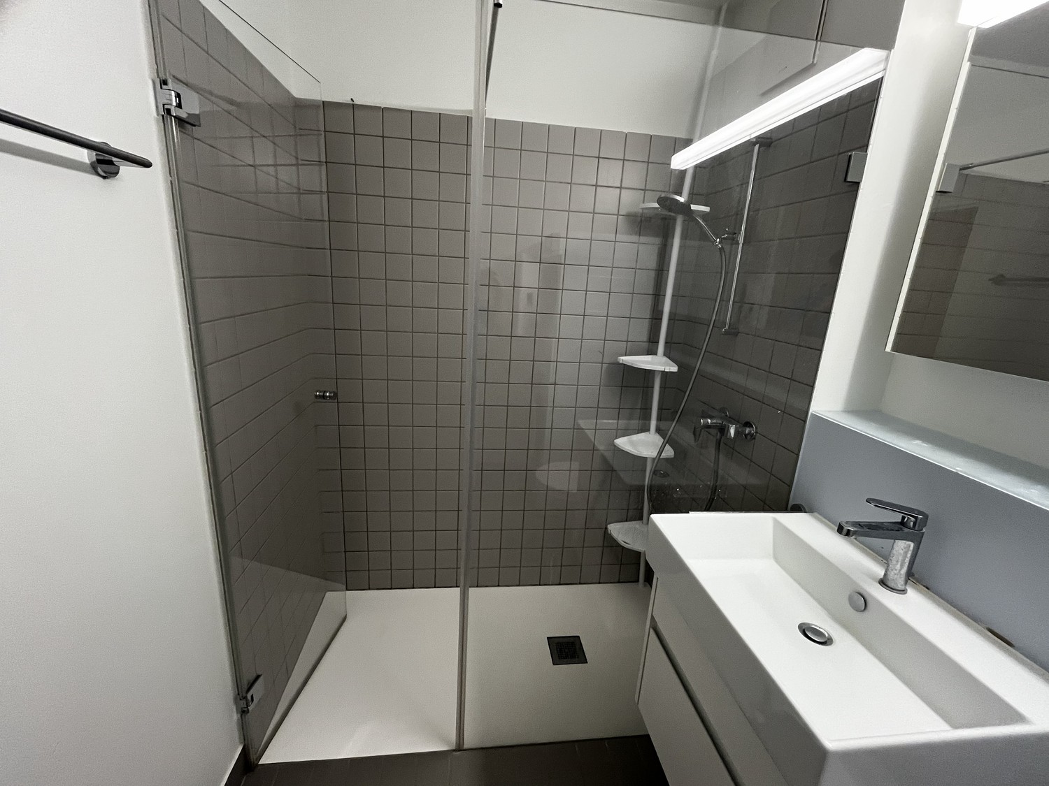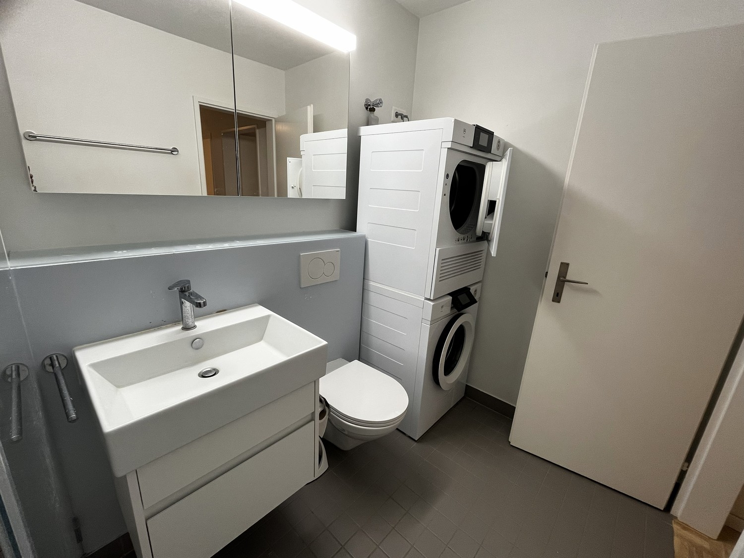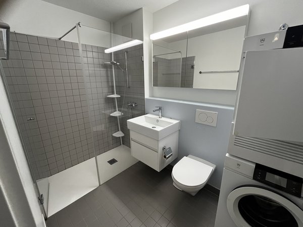 Grosszügige Dusche mit Lavabo, WC und eigener Waschmaschine / Tumbler sowie separates Gäste-WC.