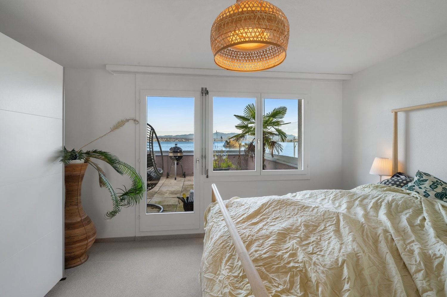 Das Schlafzimmer mit Terrassenzugang bietet einen wunderbaren Blick auf den See und sorgt für erholsame Nächte. Ein separates Zimmer eignet sich perfekt als Büro oder Gästezimmer.