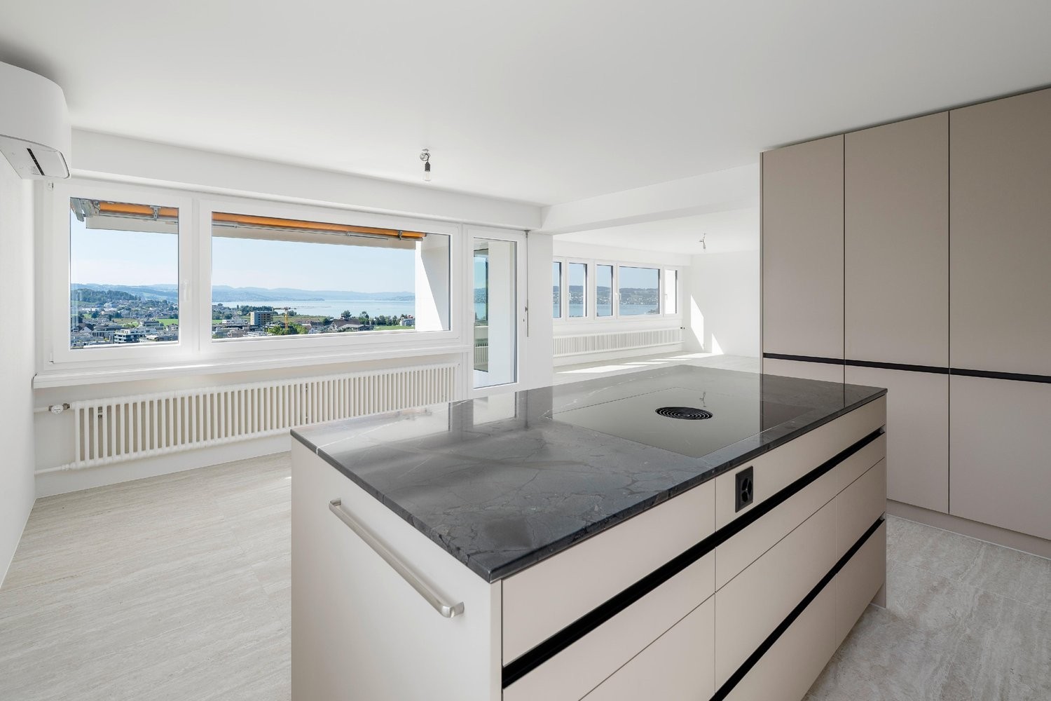 300 Grad Sicht über den Zürichsee und die Berge. Durch die grossen Fensterfronten geniessen Sie den Sonnenauf wie auch den Sonnenuntergang eine Wohnung voller Licht und Weite.