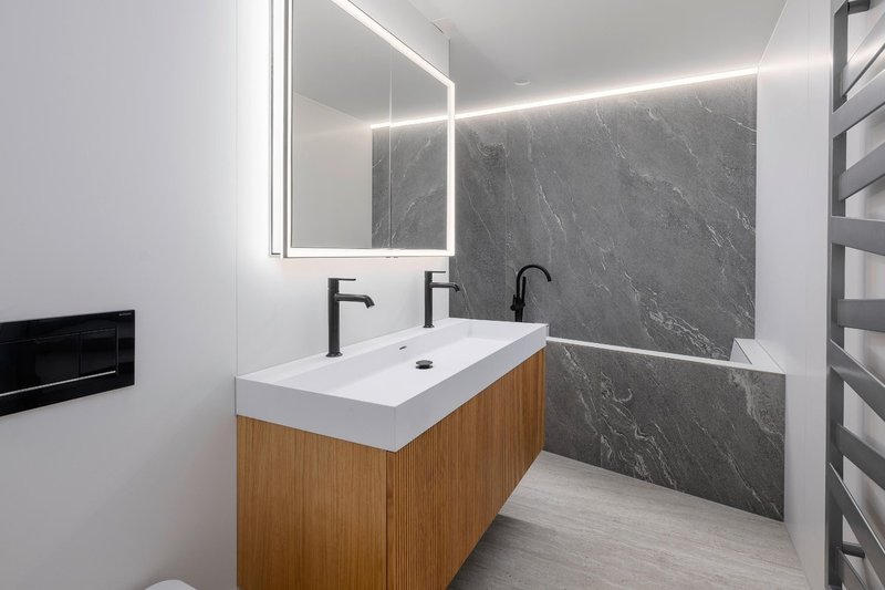 Vier helle Schlafzimmer zwei davon mit Klimagerät, eines zusätzlich mit Balkon sorgen für Rückzugsorte mit viel Privatsphäre. Drei moderne Nasszellen mit hochwertigen Materialien bieten zusätzlichen Komfort: ein grosszügiges Bad mit Wanne, Dusche und Dusch-WC, ein weiteres Duschbad sowie ein Gäste-WC mit Waschmaschine und Trockner.