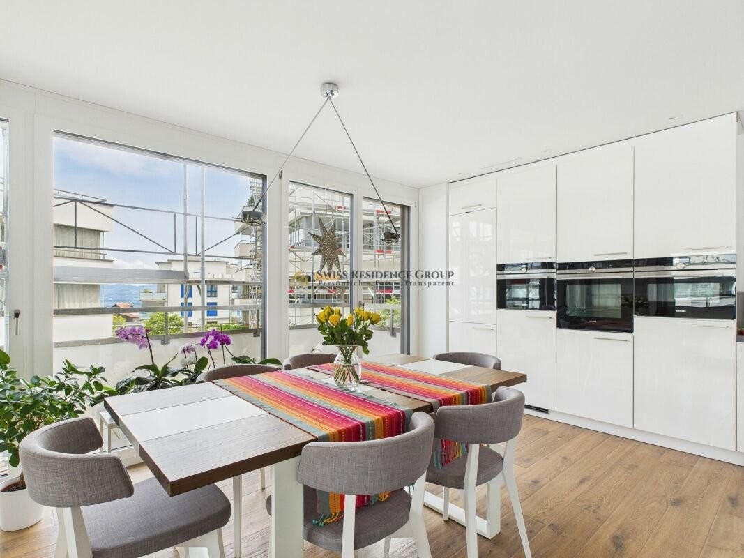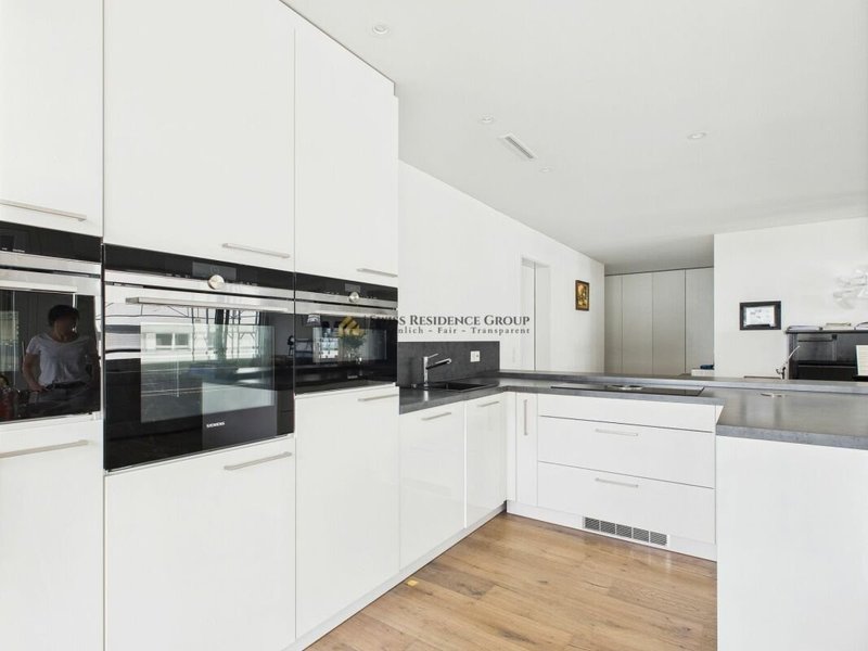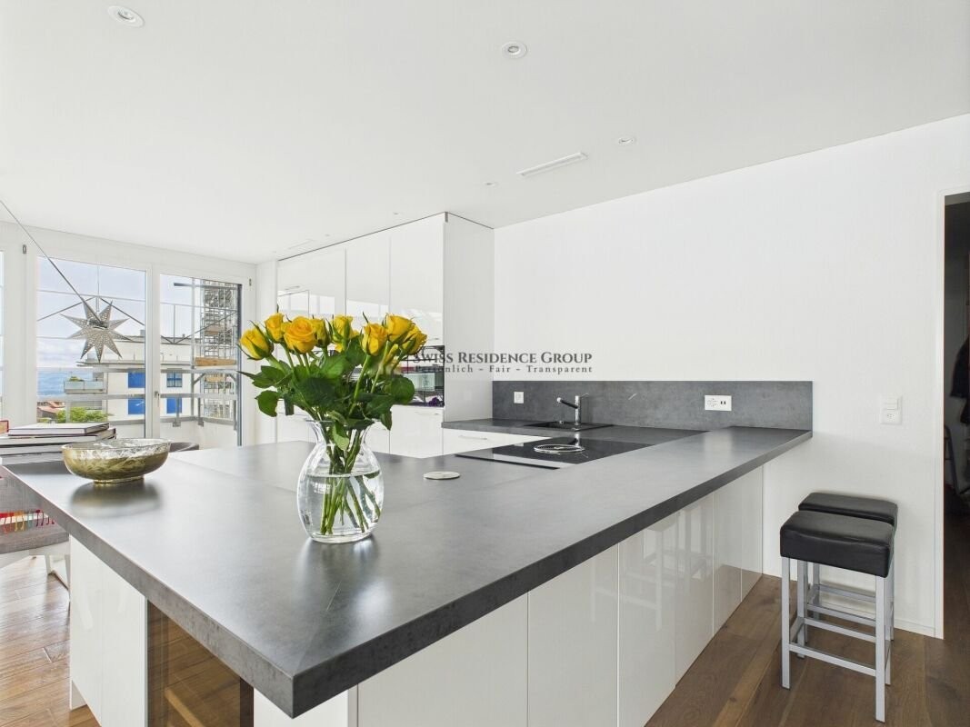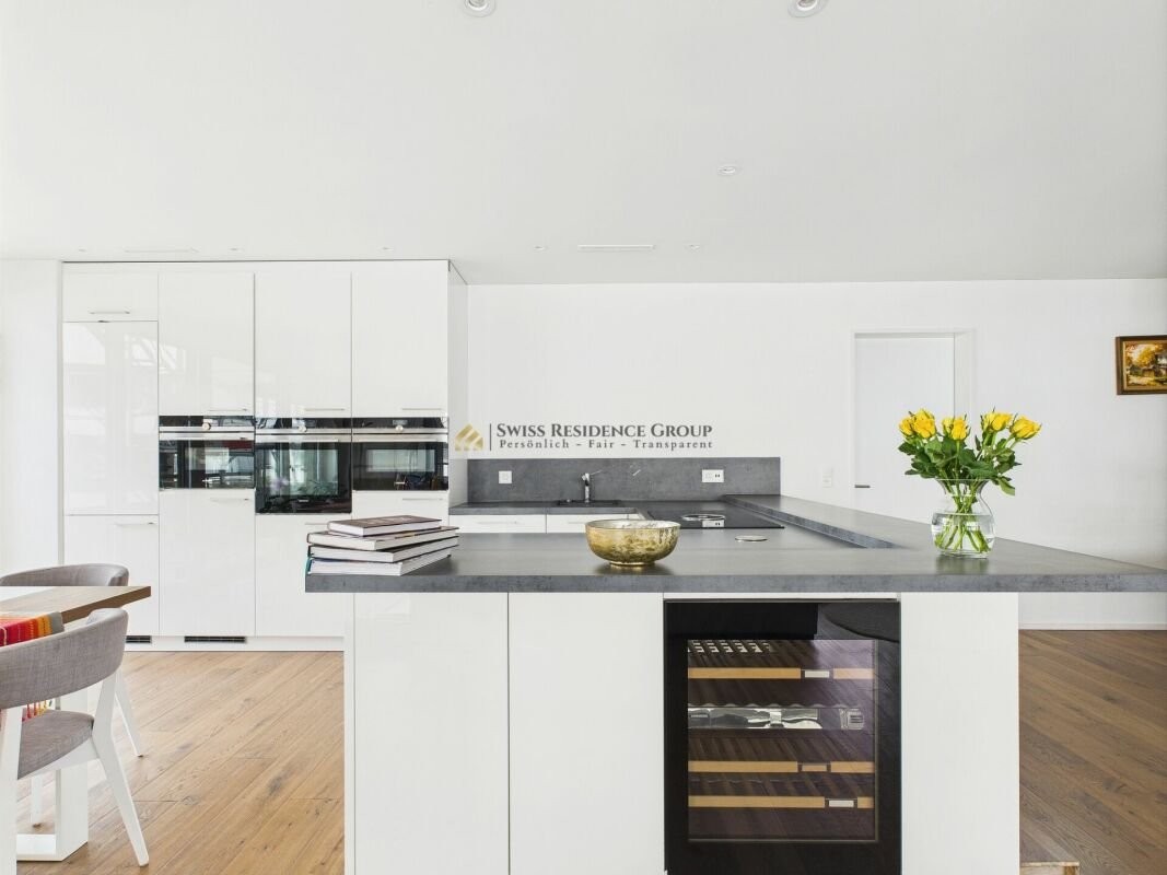 Die Küche ist ein echtes Highlight: Ausgestattet mit einem Backofen, einem Steamer und einem Miele Weincooler lässt sie keine Wünsche offen. Das moderne Kochfeld mit integriertem Dampfabzug von BORA garantiert Ihnen nicht nur ein einzigartiges Kocherlebnis, sondern auch höchsten Komfort. Der grosse Balkon (25 m², davon 19 m² verglast) lädt Sie dazu ein, den atemberaubenden Ausblick bei jedem Wetter zu geniessen. Deckenlichtspots im Balkonbereich setzen zusätzlich elegante Akzente.