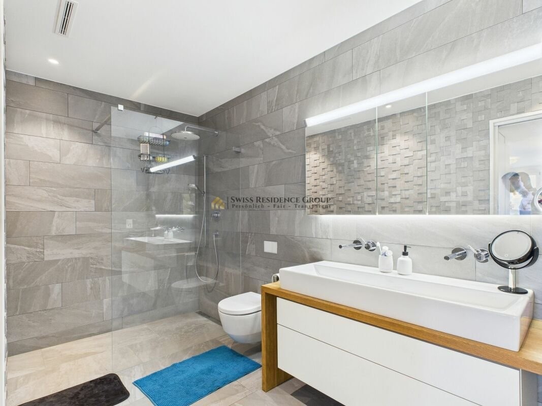 Zwei elegante Nasszellen - eine mit einer Dusche und die andere mit einer Badewanne, sodass Sie für jedes Bedürfnis bestens ausgestattet sind.