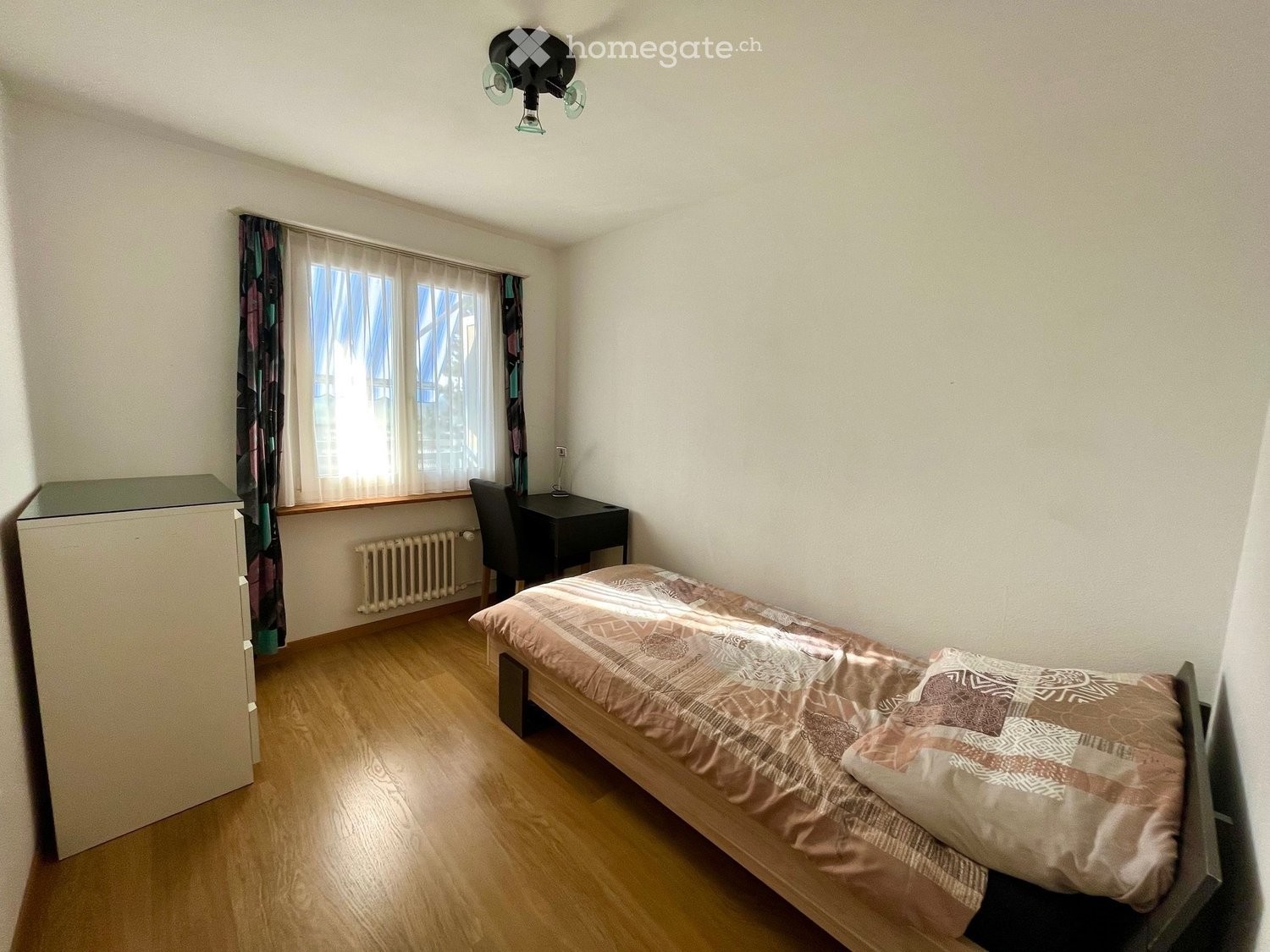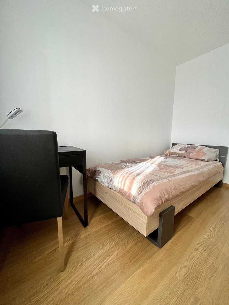 Das möblierte Zimmer bietet alles, was man für einen unkomplizierten Alltag braucht: ein bequemes Bett, ein kleines Sideboard, einen Schreibtisch und einen Stuhl. Bad, Küche und Waschküche stehen zur gemeinsamen Nutzung zur Verfügung.