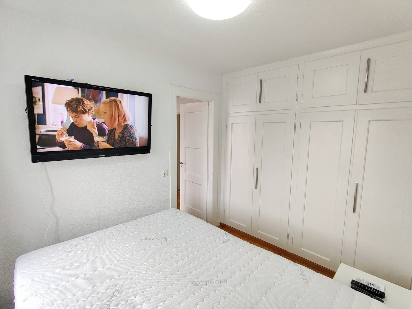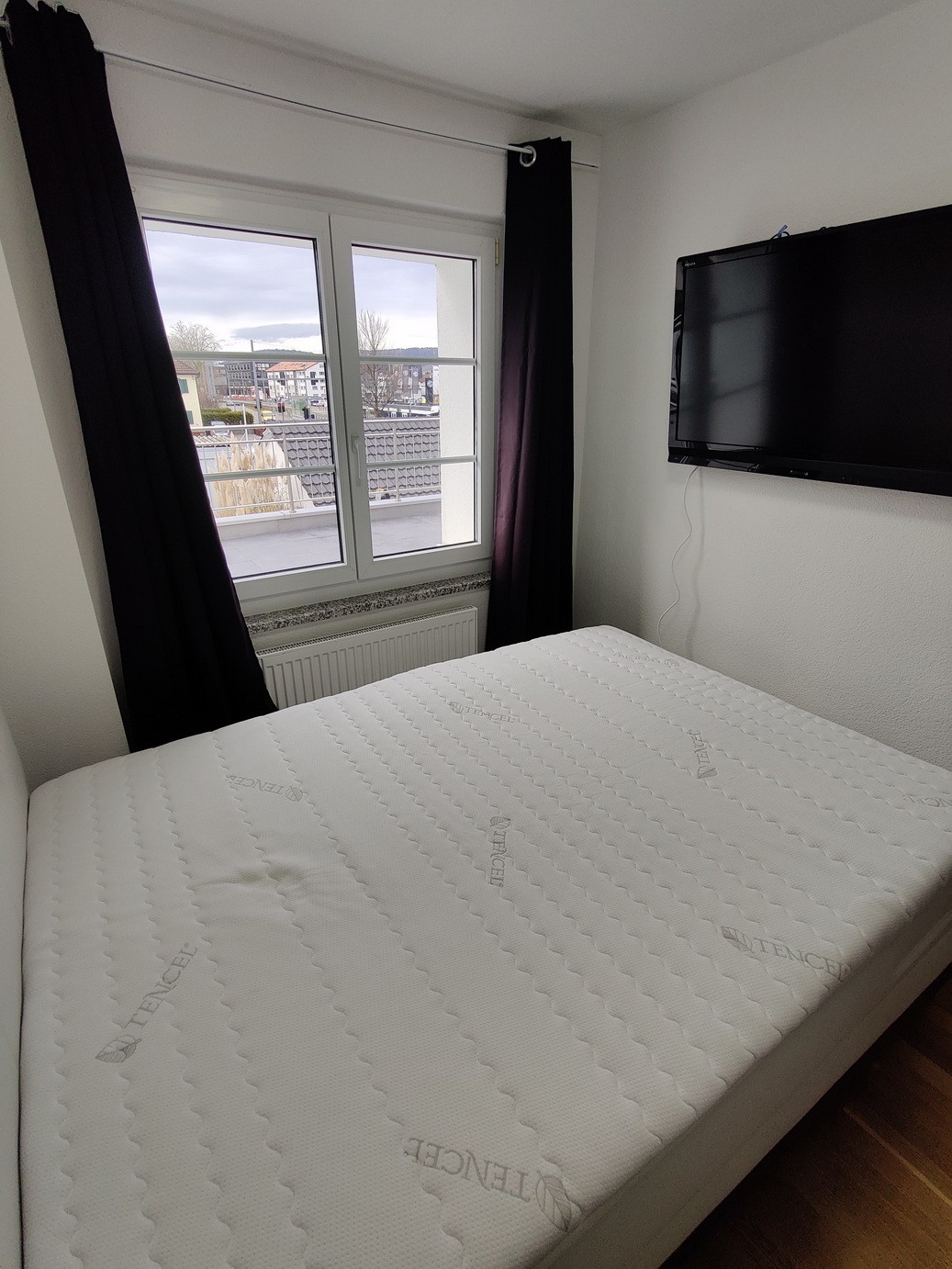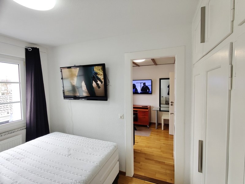 • Private bedroom with new 140 cm Hasena box spring bed, large built-in wardrobe, and TV