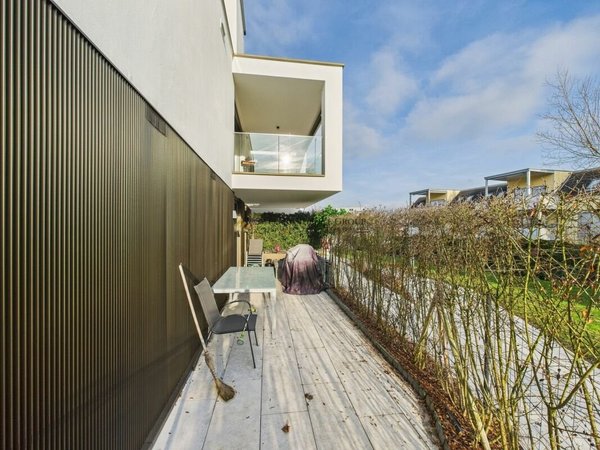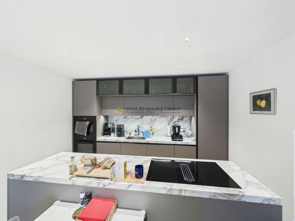 Das Herzstück der Wohnung bildet der offene Wohn- und Essbereich mit einer modernen Luxus-Küche, ausgestattet mit hochwertigen Miele-Geräten. Grosszügige Fensterflächen sorgen für viel Tageslicht und einen fliessenden Übergang zum gedeckten Gartensitzplatz von ca. 25 m² sowie zum privaten Garten mit ca. 64 m² - ideal für entspannte Stunden im Freien oder gesellige Abende.