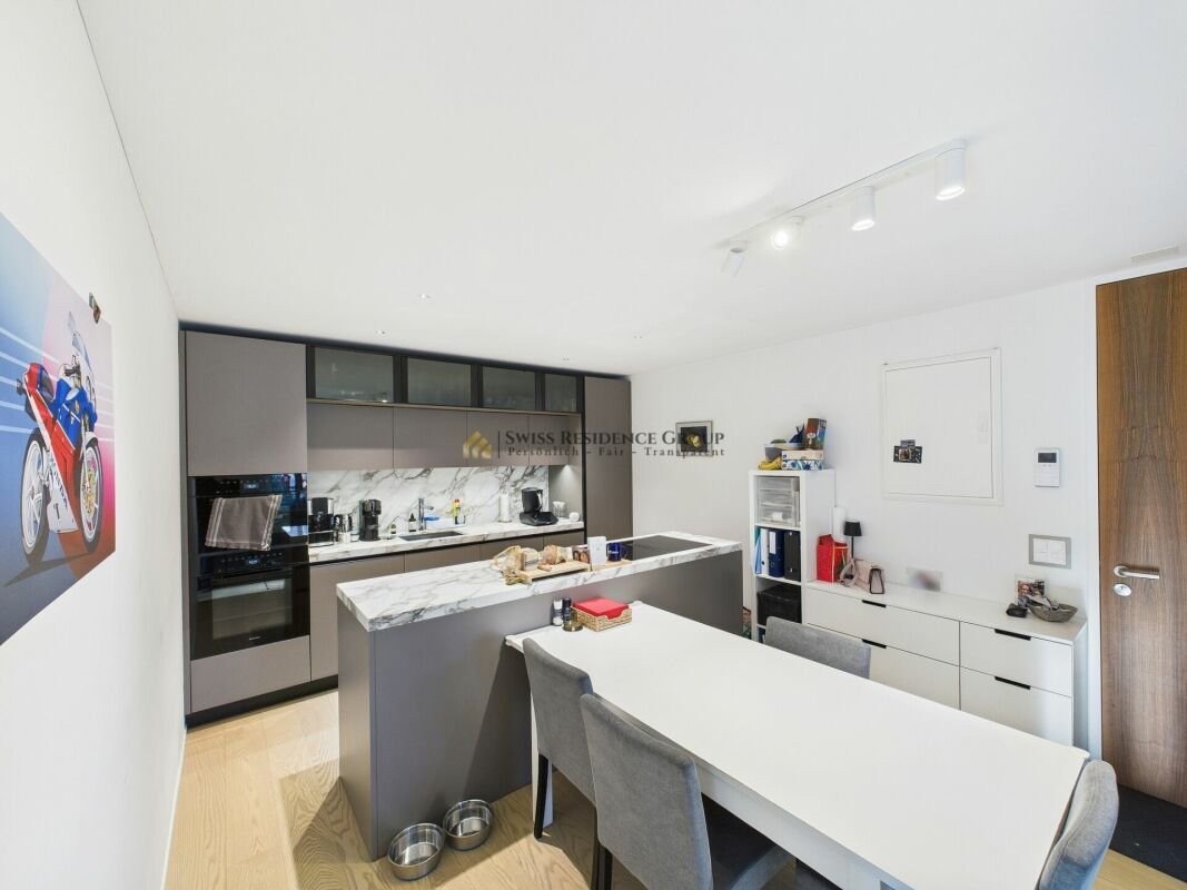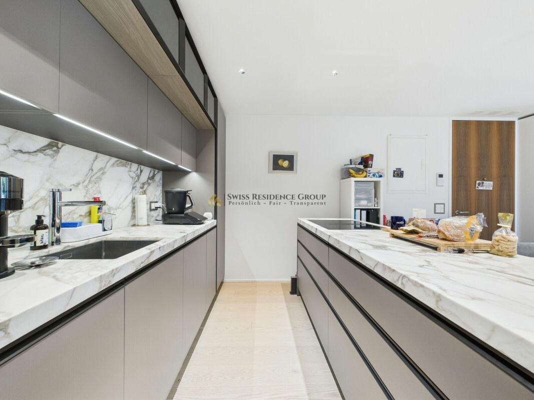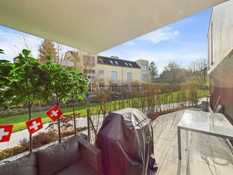 Das Herzstück der Wohnung bildet der offene Wohn- und Essbereich mit einer modernen Luxus-Küche, ausgestattet mit hochwertigen Miele-Geräten. Grosszügige Fensterflächen sorgen für viel Tageslicht und einen fliessenden Übergang zum gedeckten Gartensitzplatz von ca. 25 m² sowie zum privaten Garten mit ca. 64 m² - ideal für entspannte Stunden im Freien oder gesellige Abende.