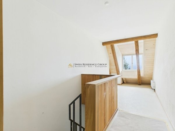 Die Wohnung beeindruckt durch grosszügige Raumhöhen, naturbelassene Lehmgussböden und Eichenholztreppen, die ein harmonisches Zusammenspiel von Ästhetik und Funktion schaffen.