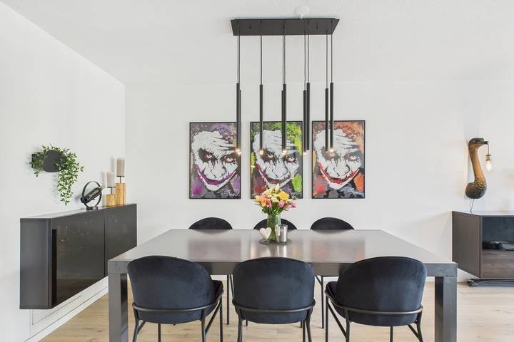 Die 164 m² Gesamtnutzfläche verteilen sich auf drei Etagen mit 5.5 Zimmern und verschiedenen Nebenräumen. Der helle Wohn- und Essbereich mit weiss geöltem Eichenparkett, moderner Hebeschiebetür und gemütlichem Schwedenofen bildet das Herzstück der Wohnung. Die offene Küche ist mit hochwertigen Miele-Geräten wie Steamer, Glaskeramik-Kochfeld und Wärmeschublade ausgestattet und verfügt über einen praktischen Frühstückstisch.
