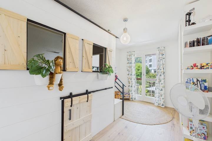 Die Nassbereiche sind zeitlos gestaltet und umfassen ein Bad mit Dusche/WC sowie eine separate Gästetoilette. Die flexiblen Zimmer lassen sich vielseitig nutzen, eines davon bietet direkten Zugang zu einem gedeckten Balkon.