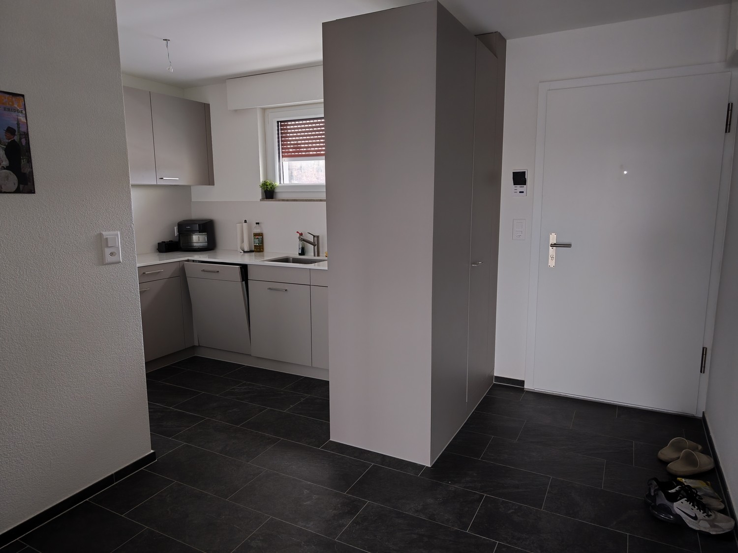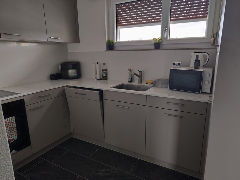 Moderne Küche: Funktional eingerichtet mit hellen Schränken,Geschirrspüler, Mikrowelle