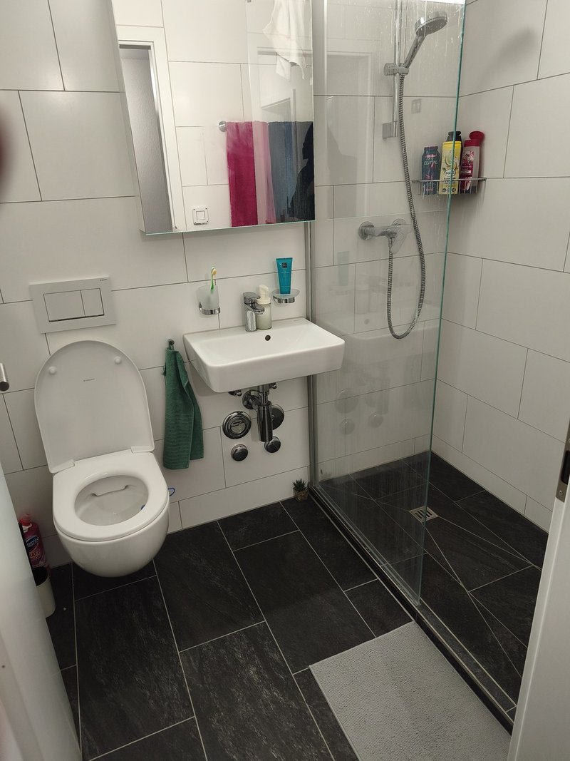 Zeitgemässes Badezimmer: Mit Schwarzen Fliesen, Glasdusche und praktischen Spiegelschrank
