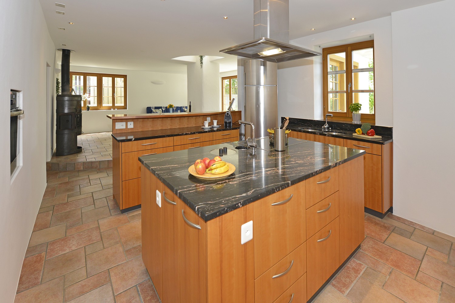 Küche: Ausgestattet mit Holzschränken, Granit-Arbeitsplatten, praktischer Kochinsel und viel Stauraum