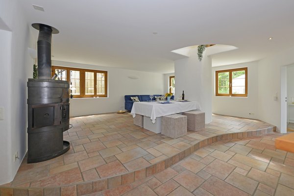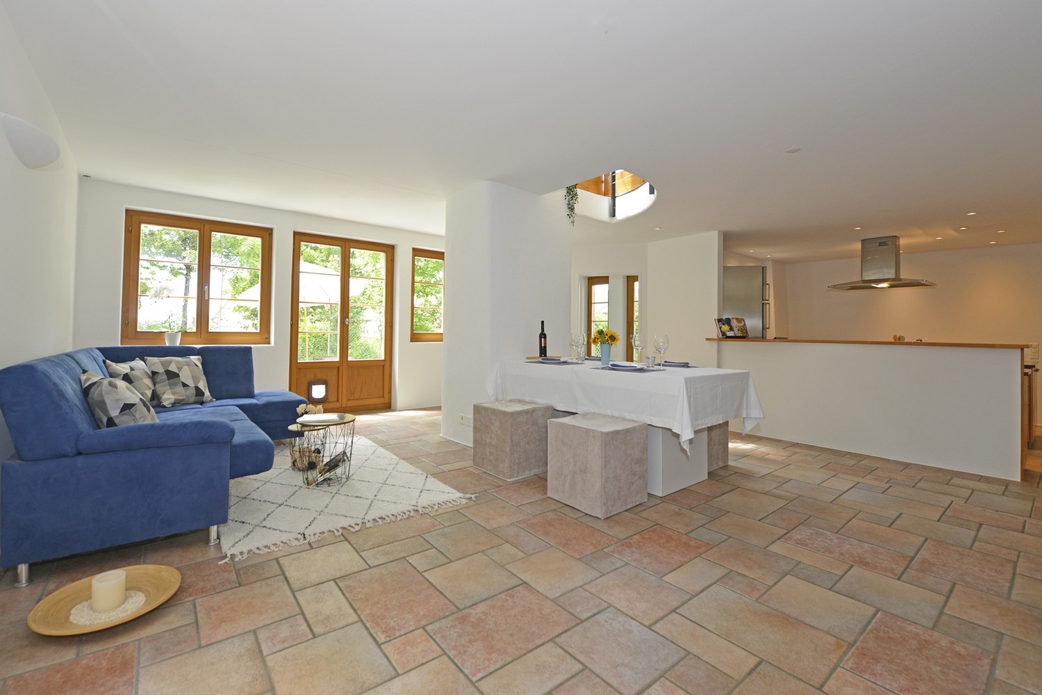 Grosszügiger Wohn-/Essbereich: Mit gemütlichem Schwedenofen und direktem Zugang zur Terrasse