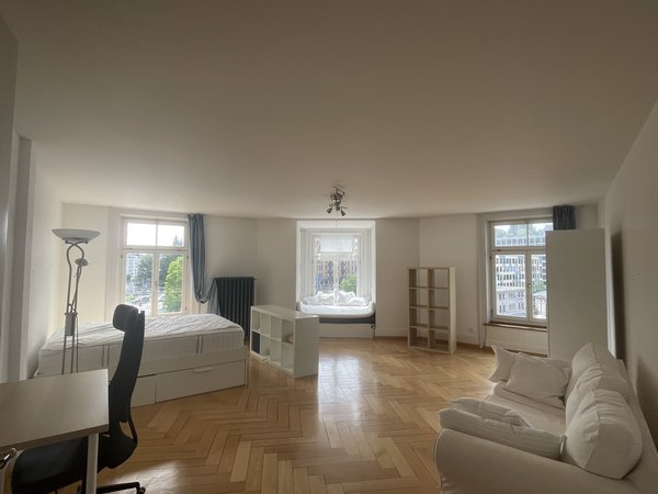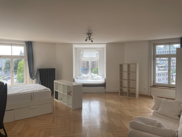 Das Zimmer ist einzigartig gross (um die 35m2) mit Parket, viel Licht und sogar einem kleinen Erker (perfekt zum Lesen!).