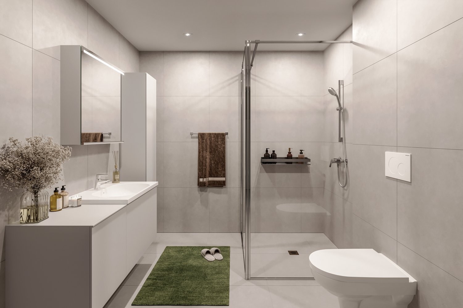 - Elegante Badezimmer mit Dusche und stilvollen Keramikplatten