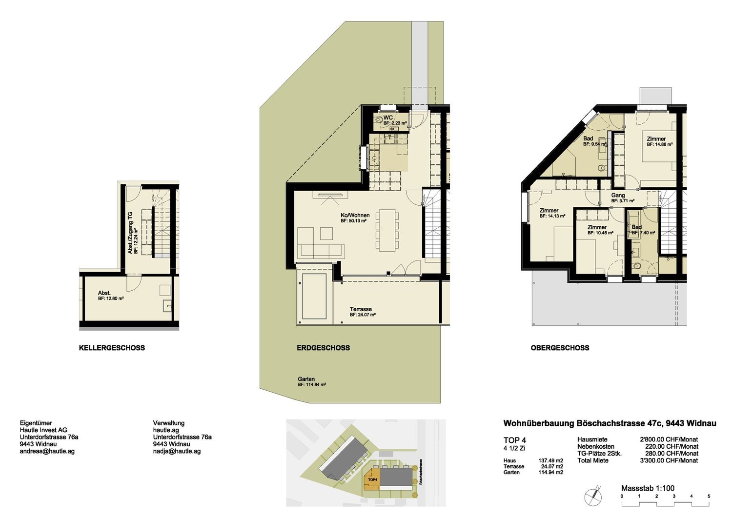 Der Hausteil befindet sich an der Böschachstrasse 47 in Widnau, in einer zentralen und sehr verkehrsgünstigen Wohnlage. Einkaufsmöglichkeiten erreichen Sie in rund 15 Gehminuten, das Schulhaus Schlatt liegt etwa 10 Minuten zu Fuss entfernt. Die nächste Bushaltestelle ist ebenfalls gut zu Fuss erreichbar, was eine unkomplizierte Anbindung an den öffentlichen Verkehr garantiert.