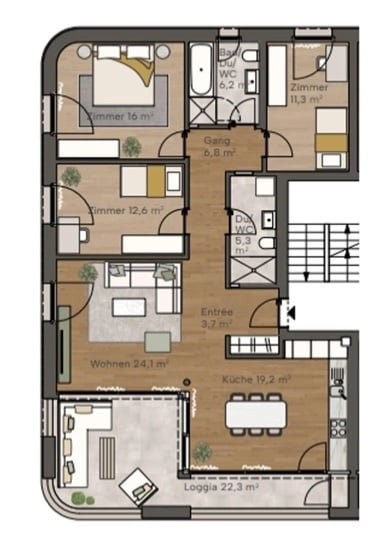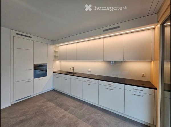 Die Wohnung umfasst 105.2 m² und verfügt über ein grosses Wohnzimmer mit einer offenen, geräumigen Küche, ausgestattet mit hochwertigen V-Zug Geräten, sowie Zugang zu einer 22.3 m² grossen Lounge-Terrasse ? perfekt für gemütliche Grillabende. Auf dem Balkon befindet sich zudem ein kleiner Abstellraum. Weiter gibt es drei Zimmer und zwei geräumige Badezimmer.