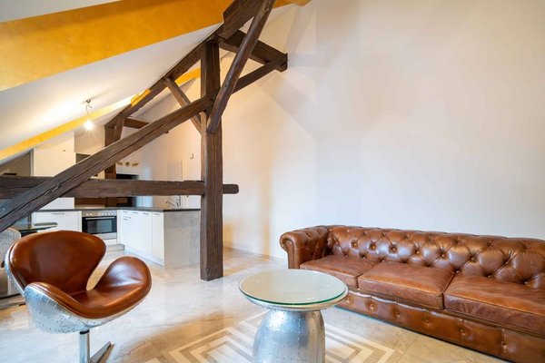 - Séjour lumineux avec poutres apparentes et poêle (décoratif)