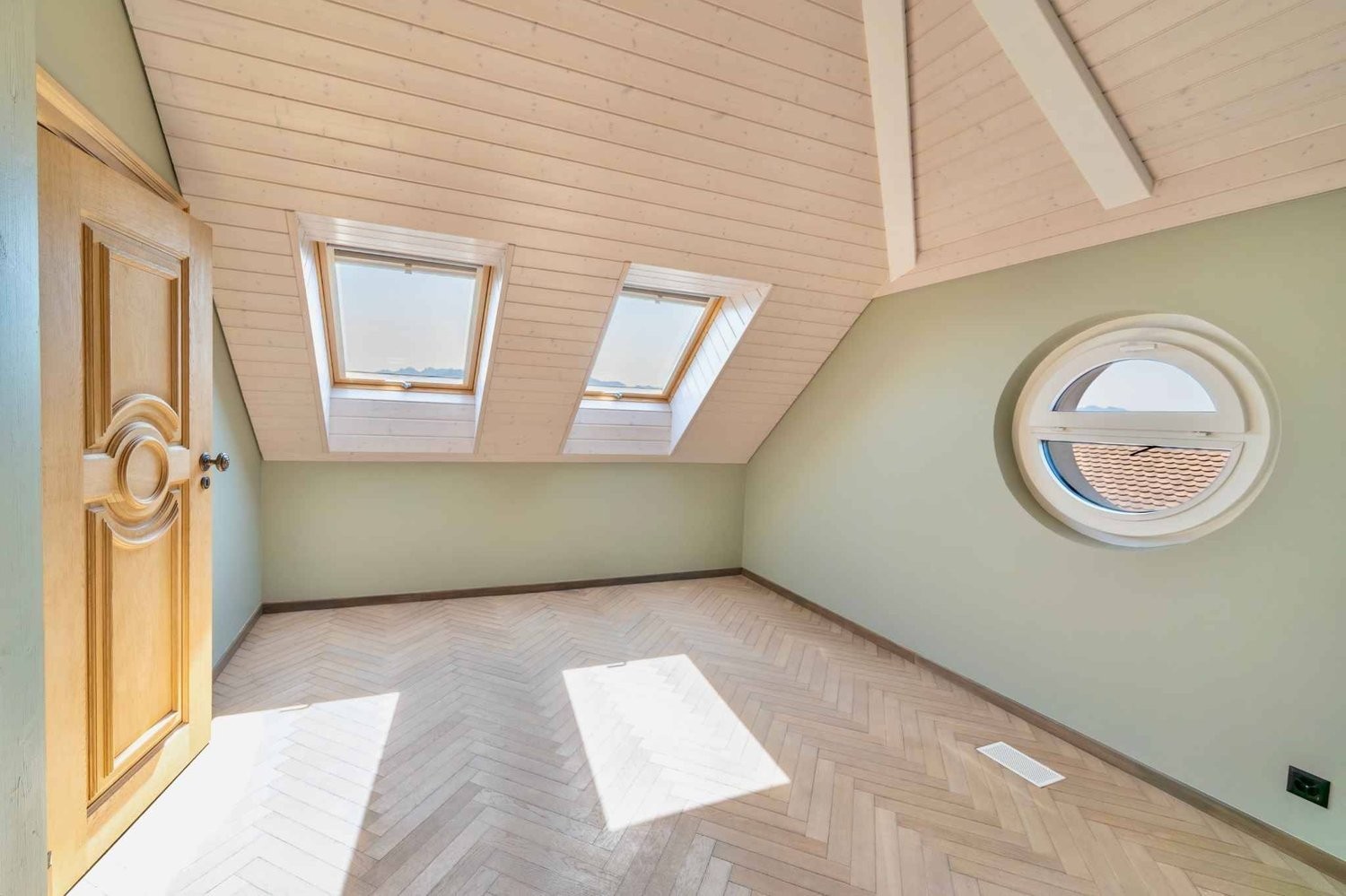 Un hall d'accueil avec armoires murales mène à un vaste séjour agrémenté d'une cheminée en pierre et d'une bibliothèque. Un espace repas lumineux, face à une vue spectaculaire sur le lac et les Alpes qui accompagne chaque moment de la journée.