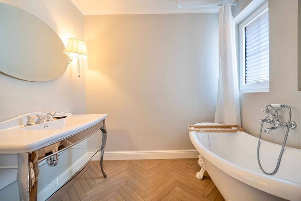 Une suite parentale comprenant un dressing et d'une salle de bain attenante équipée d'une baignoire design Starck, vintage invitant à la détente et au bien-être.