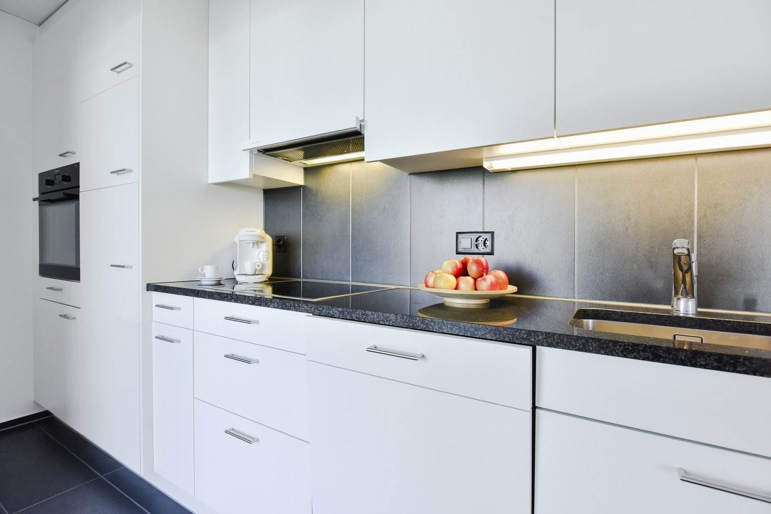 - Küche mit Plattenboden, Glaskeramikkochfeld