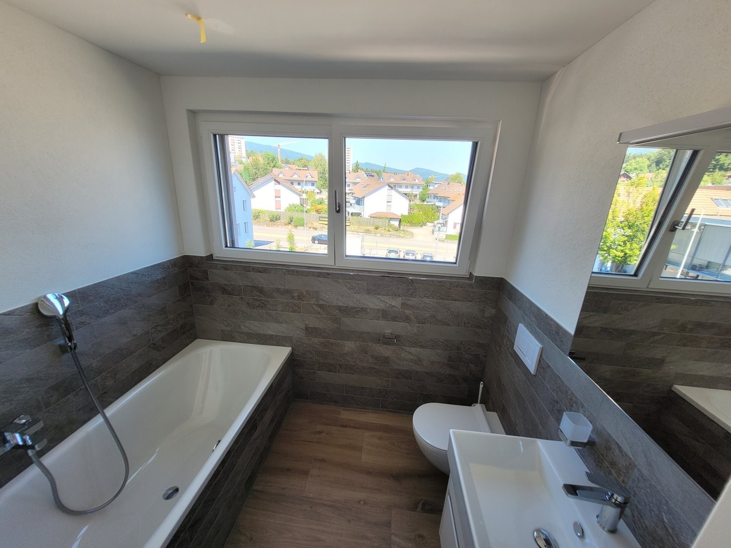 Der Balkon wird schnell zum Lieblingsplatz – Kaffee am Morgen mit Blick ins Grüne. Praktisch: ein Reduit mit eigenem Waschturm, direkt in der Wohnung.
