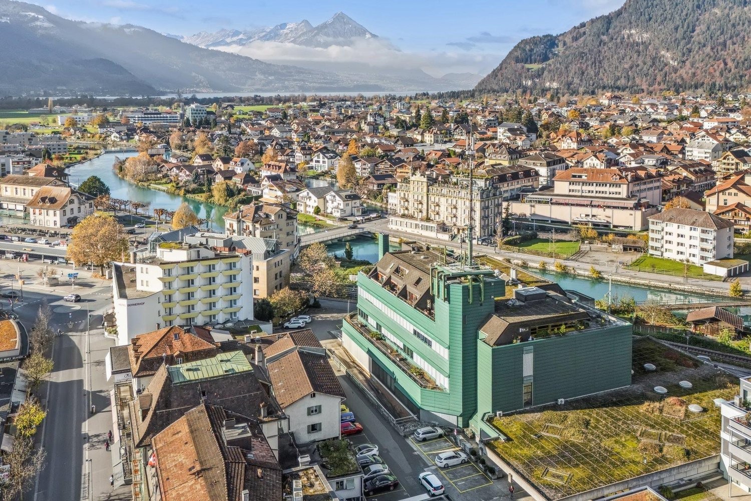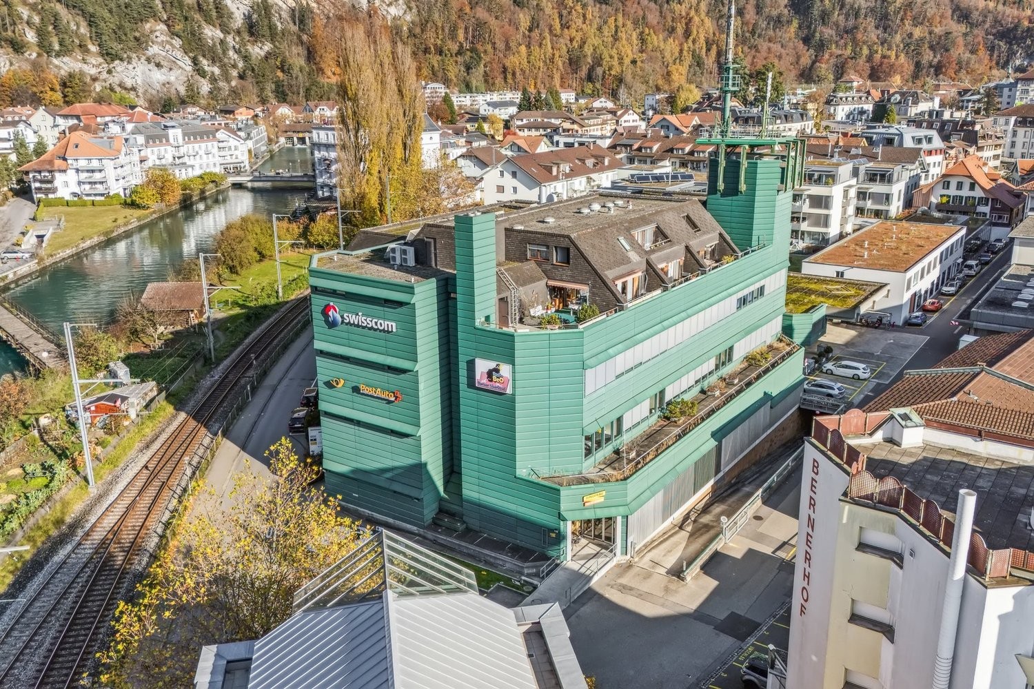 Die Liegenschaft ist äusserst zentral gelegen und der Bahnhof Interlaken West ist in wenigen Gehminuten erreichbar. Diverse Verpflegungs- und Einkaufsmöglichkeiten (z.B. Coop, Migros, etc.) befinden sich in unmittelbarer Nähe.