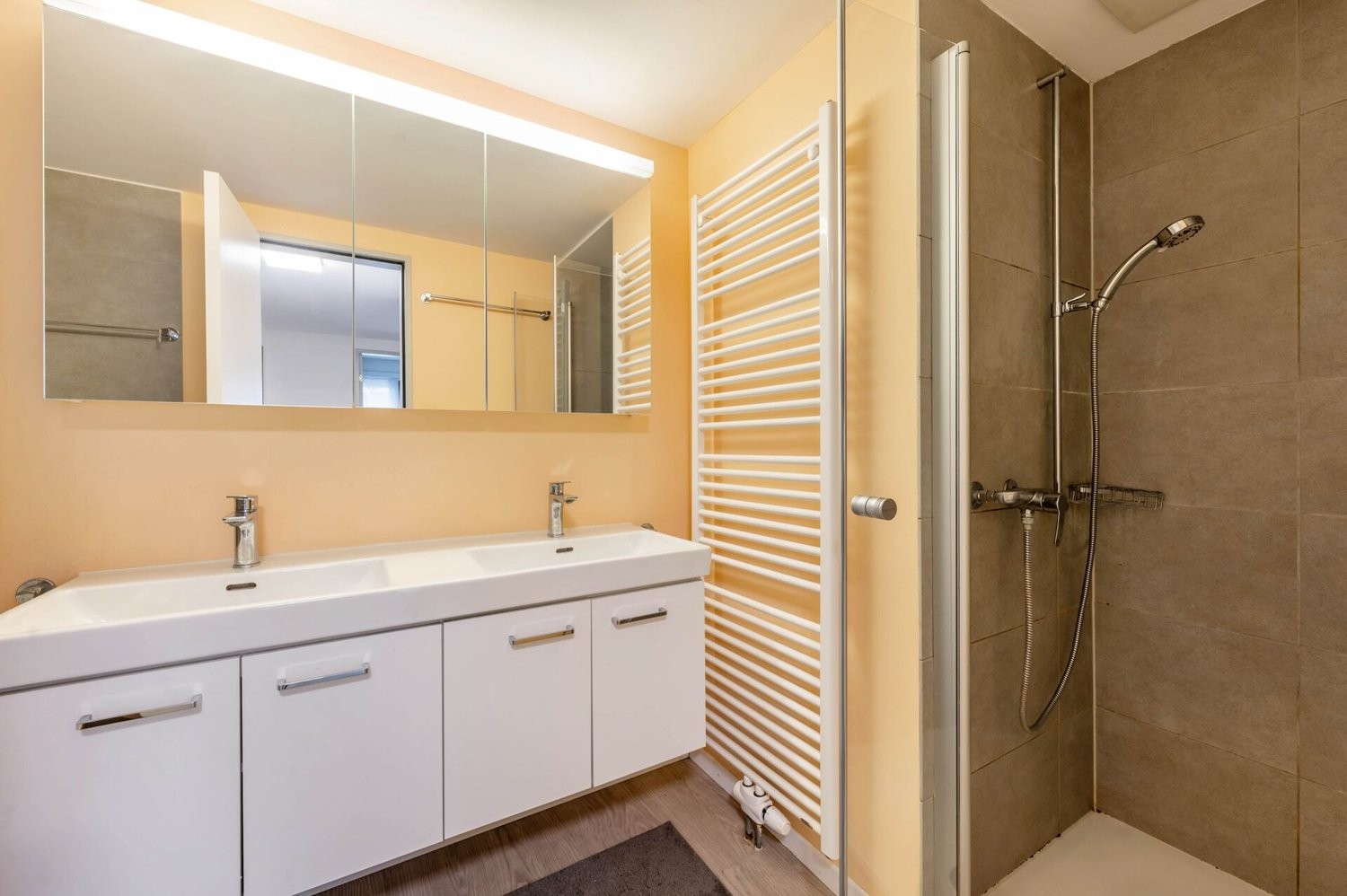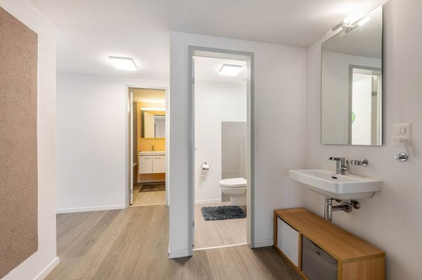 Zwei Eingänge - einer davon mit Windfang, der andere direkt ins Homeoffice - erschliessen die unterste der sieben Einheiten im Trakt A der Terrassenüberbauung. Im Anschluss an den Windfang findet sich der helle, grosszügige Wohnbereich, welcher nicht nur Zugang zur Südostterrasse ermöglicht, sondern auch einen wunderbaren Blick auf die Aare freigibt. Die gegenüberliegende Küche mit grosszügigem Essplatz komplettiert den Wohn-/Essbereich. Der Korridor erschliesst drei Schlaf- und Arbeitszimmer im Westtrakt der Wohnung. Das rund 20 m² grosse Zimmer bietet die Möglichkeit, bei Bedarf in zwei separate Räume unterteilt zu werden. Vom Korridor aus gelangen Sie auf die zweite, westseitige Terrasse, die mit reichlich Abendsonne und einem Aussencheminée zum Verweilen einlädt. Ein Nassraum mit Doppelwaschtisch, grossem Spiegelschrank, Dusche, Badewanne und Handtuchradiator sowie eine separate Toilette mit Lavabo und Spiegelschank runden das Raumangebot im Westtrakt ab.