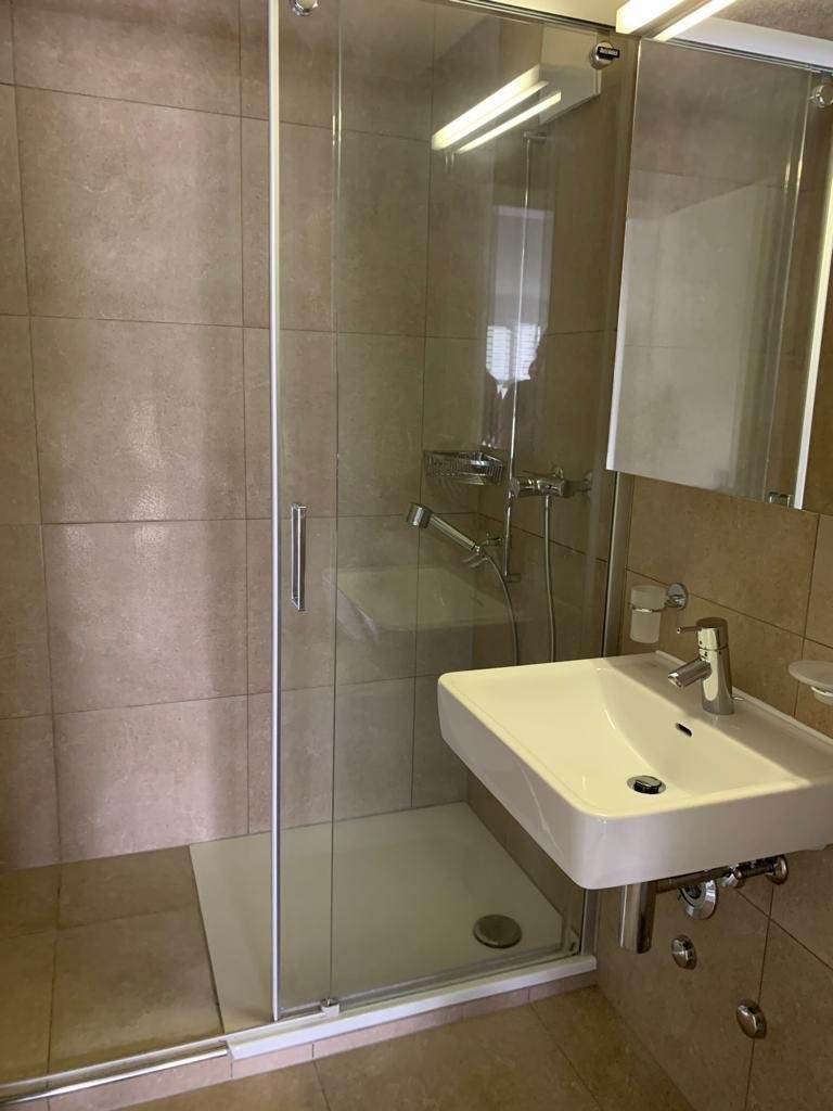 - Badezimmer mit WC, Lavabo, Spiegelschrank und Dusche