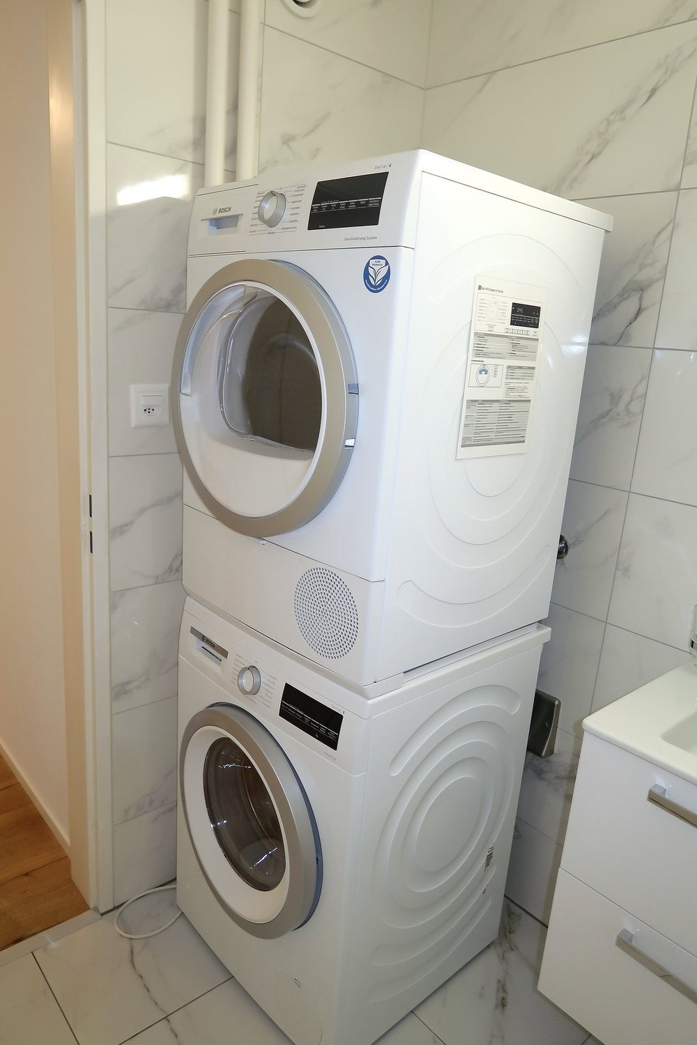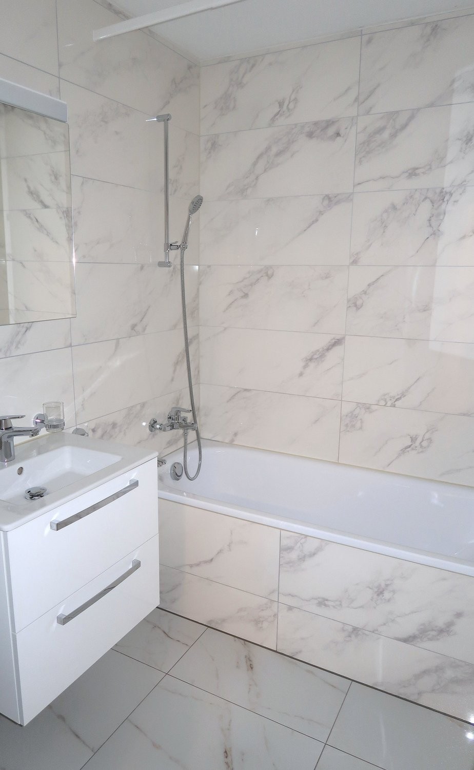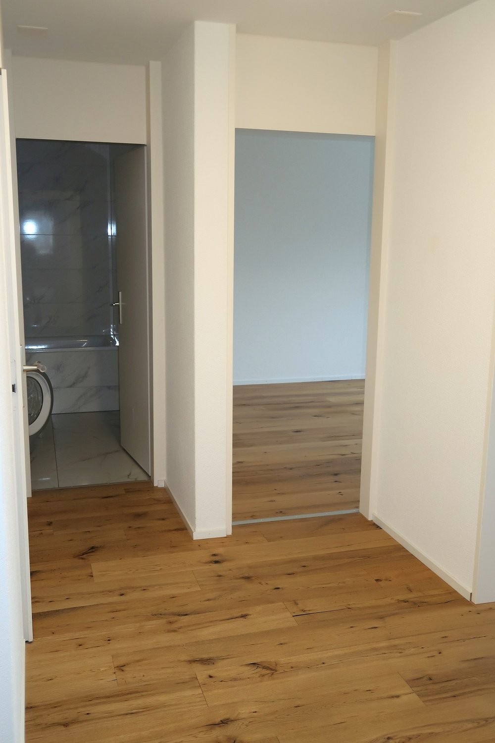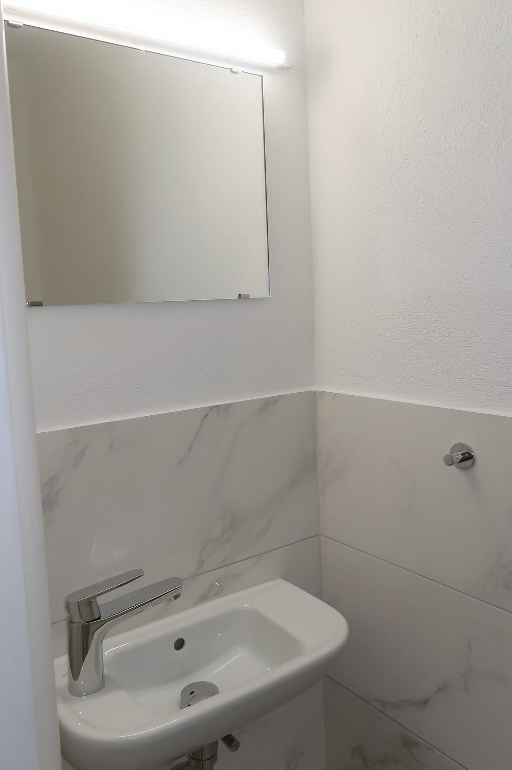 - Bad mit Badewanne, Lavabo, WC und integrierter Waschmaschine/Tumbler