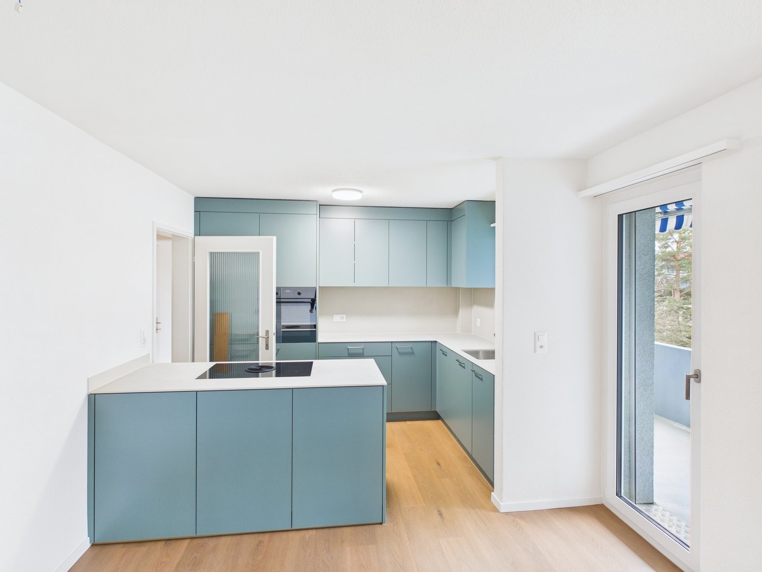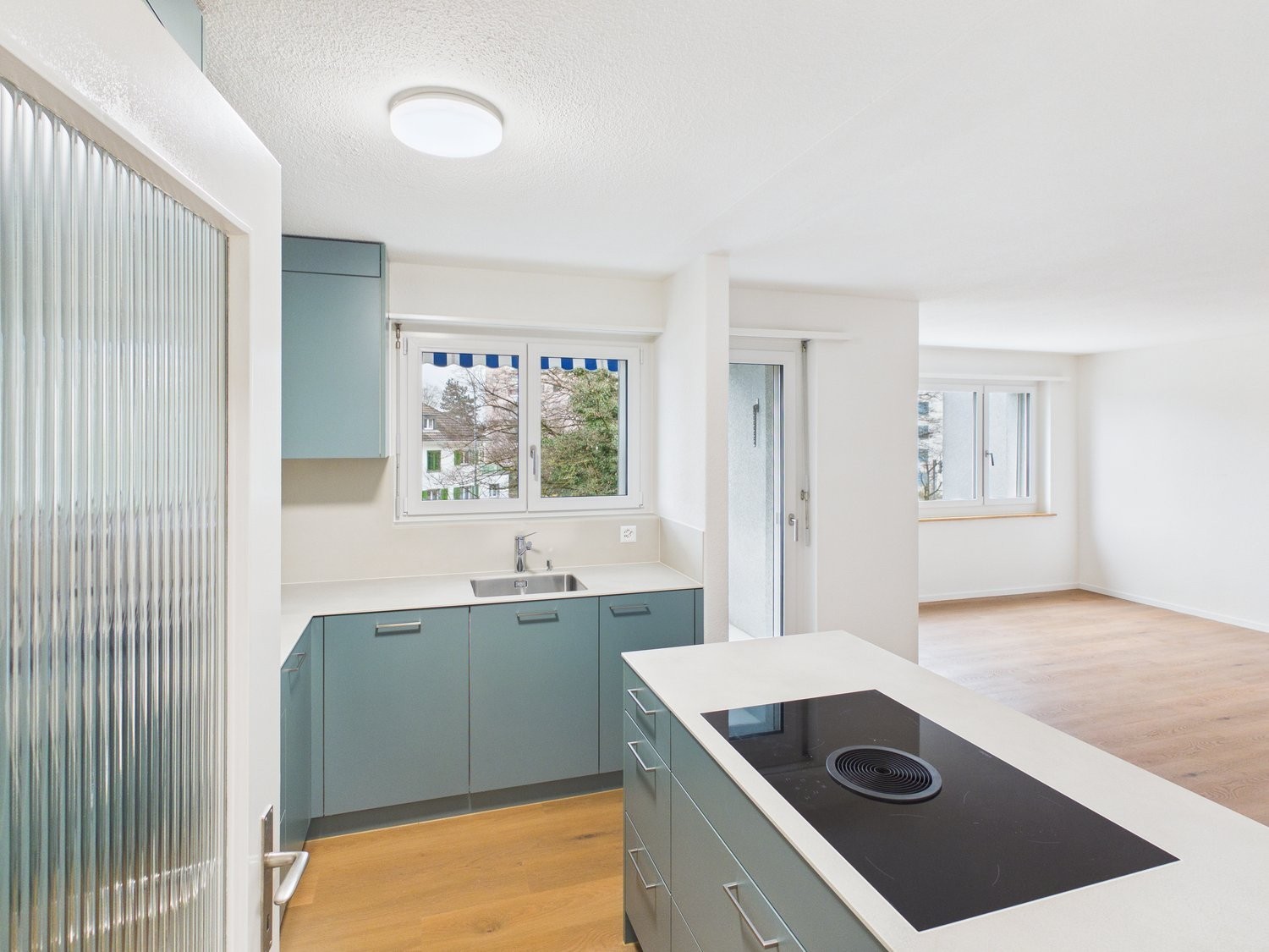 Moderne Küche: Ausgestattet mit weissen Arbeitsplatten, modernen Schränken, Induktionskochfeld und Edelstahlspüle