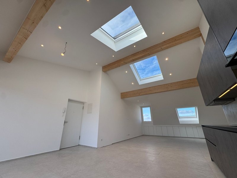 Grifflose Einbauschränke, Dachfenster, grossformatige Bodenplatten