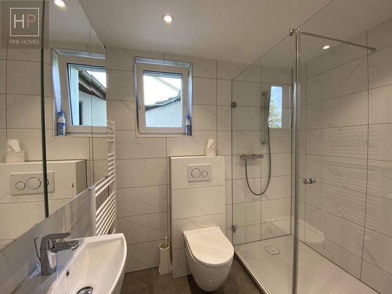 Im Erdgeschoss erwartet Sie eine helle und großzügige Küche, die perfekt mit dem angrenzenden Wohnzimmer und Esszimmer harmoniert. Ein Büro/Gästezimmer mit eigener Dusche und WC rundet das Raumangebot im Erdgeschoss ab. Zwei gedeckte Sitzplätze, einer direkt an die Küche angrenzend, bieten Ihnen eine herrliche Möglichkeit, entspannte Stunden im Freien zu genießen - mit viel Privatsphäre und Blick auf die sonnige Gartenanlage.