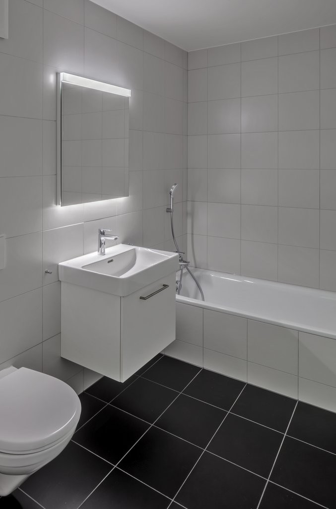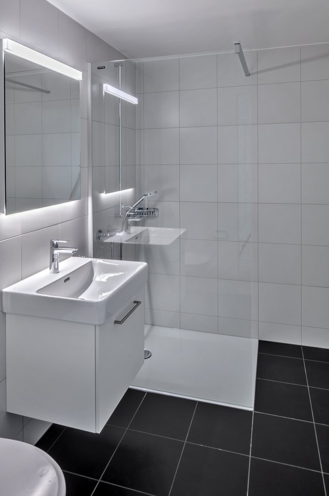 Nasszelle mit ebenerdiger Dusche mit Glastrennwand mit WM/TU