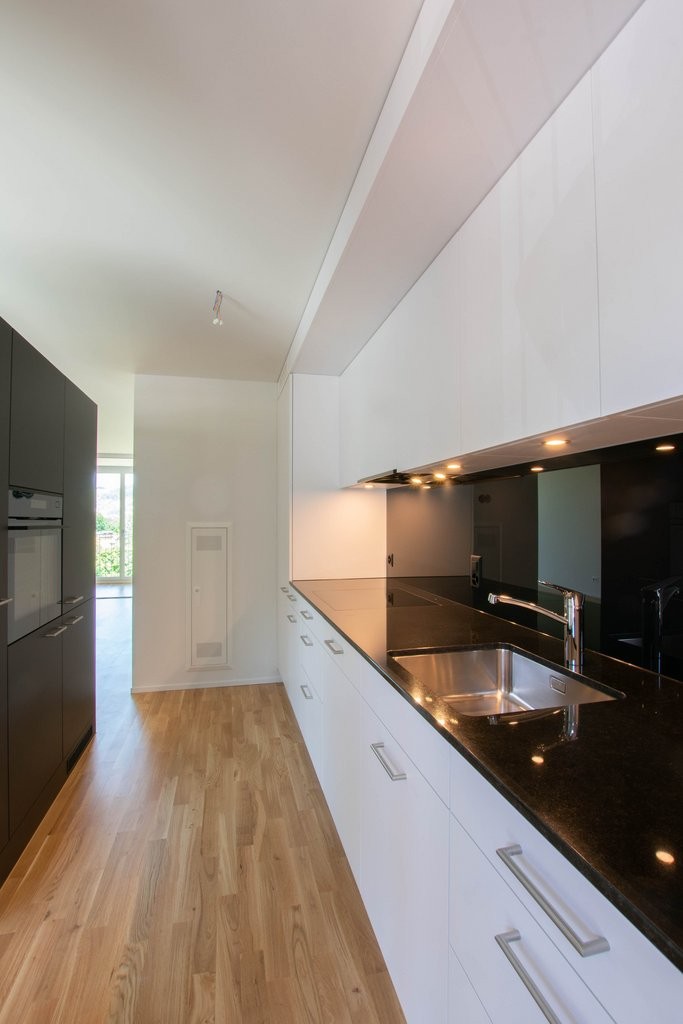 moderne Küche mit Electrolux-Geräten (Induktionskochfeld, Kombi-Steamer-Backofen, Geschirrspüler, Kühlschrank mit 3 separaten Gefrierschubladen)