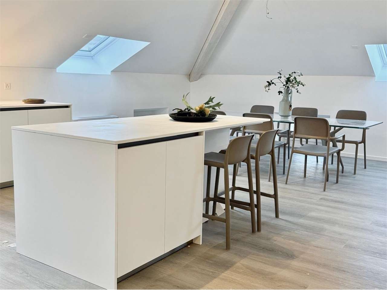 -Zona living: La zona living di 73 mq comprende un ampio soggiorno, una sala da pranzo e una moderna cucina a vista con isola dotata di armadi e sedie. Doppio forno, vetroceramica ad induzione. Tavolo da pranzo in vetro con sedie, mobile con predisposizione TV , 2 divani con 2 tavolini.
