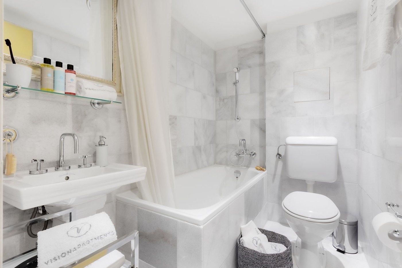 The apartment is located in a charming, historical building with a lift, situated in a quiet residential street in the heart of the hip 5th district. The location constitutes an ideal base to discover the urban city life of Zurich. A myriad of restaurants, bars and clubs can be found just around the corner. The hipshopping street Viadukt with many small shops and cafes as well as the beautiful green area Josefwiese and the Limmat river are just steps away from the property. The tram stop Quellenstrasse and the Hardbrücke railway station are also easily accessible on foot. What is more, public transportation provides great connections to the main railway station and the city center visitors will get there in less than 10 minutes. The transfer to the Airport Zurich Kloten takes 20 minutes. Please note that all apartments are equipped with a TV with international channels (TV taxes are not included in the rent).