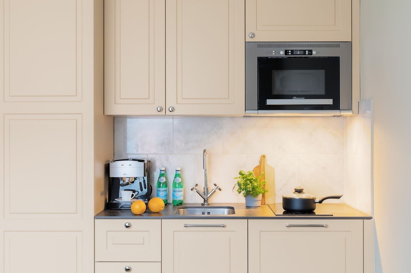 This cozy studio in Italian design offers everything that an apartment needs: a living area with parquet flooring and flat screen TV, a fully fitted kitchenette with a microwave, coffee maker, glass ceramic stove and a complete set of kitchenware, as well as a sleeping area with a comfortable double bed. The elegant marble bathroom provides hand and bathing towels, as well as toiletries and a hair dryer. Curtains and the intercom system ensure sufficient privacy.