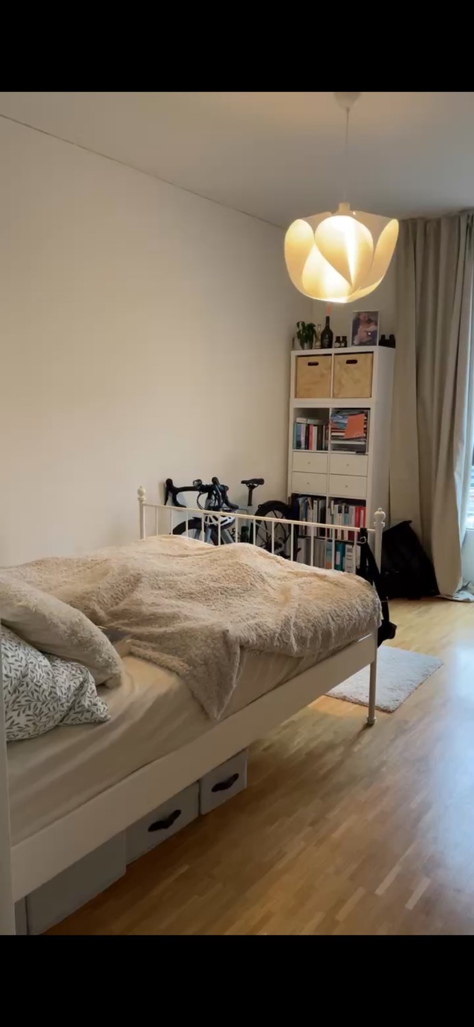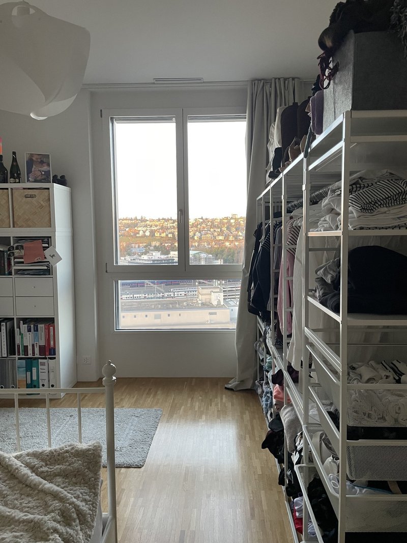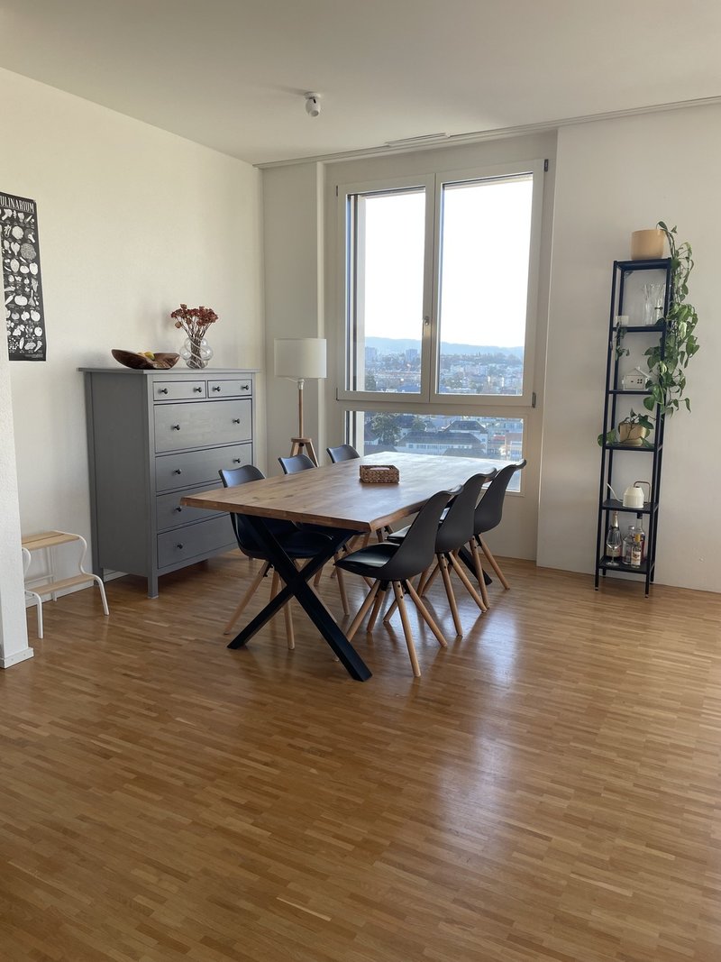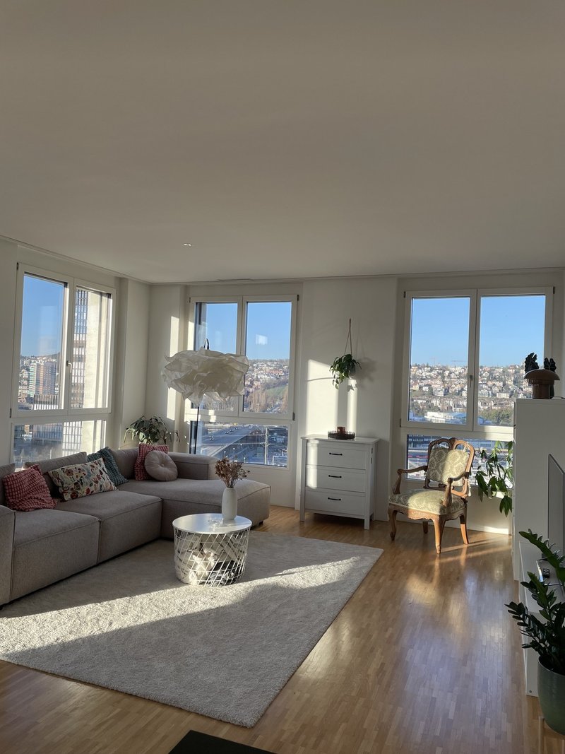 Dein Zimmer ist 15 m² gross und Teil unserer schönen 4.5-Zimmer-Wohnung mit einem grosszügigen, hellen Wohnzimmer, offener Küche sowie zwei Badezimmern – eines mit Dusche, das andere mit Badewanne und Waschturm. Die Wohnung befindet sich im 11. Stock und bietet eine wunderbare Aussicht auf Zürich Altstetten und den Hönggerberg. Dank guter Schallisolierung ist es trotz zentraler Lage angenehm ruhig.