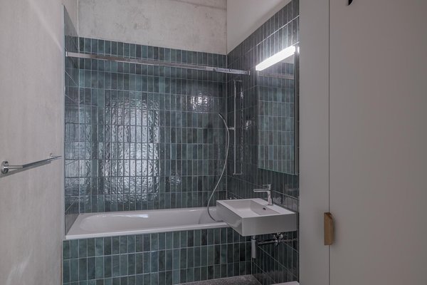 Badezimmer mit Dusche und Badewanne sowie stilvollem Farb- und Fliesendesign
