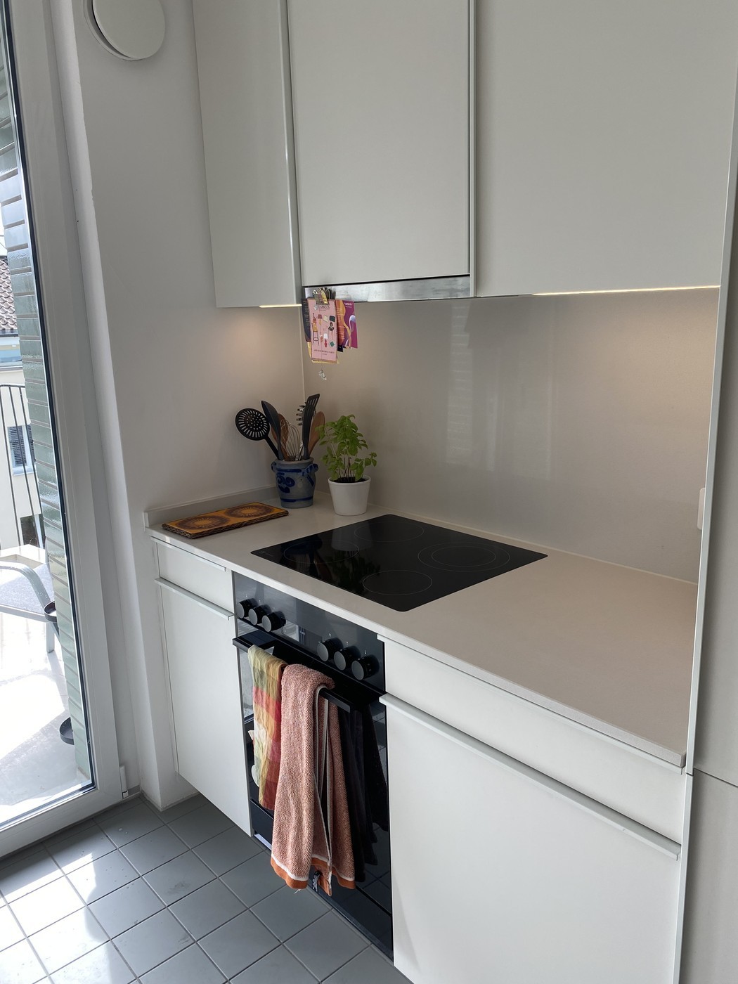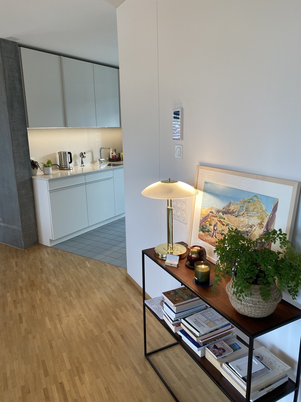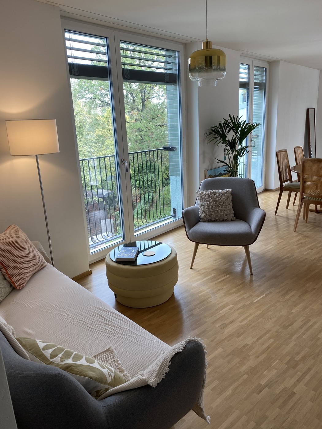 Die Wohnung hat ein sehr großes Wohn- und Esszimmer mit viel Lichteinfall und Blick auf den Park von Freibad Allenmoos. Es gibt eine großzügige Pantry-Küche, die auf den Balkon hinausführt.