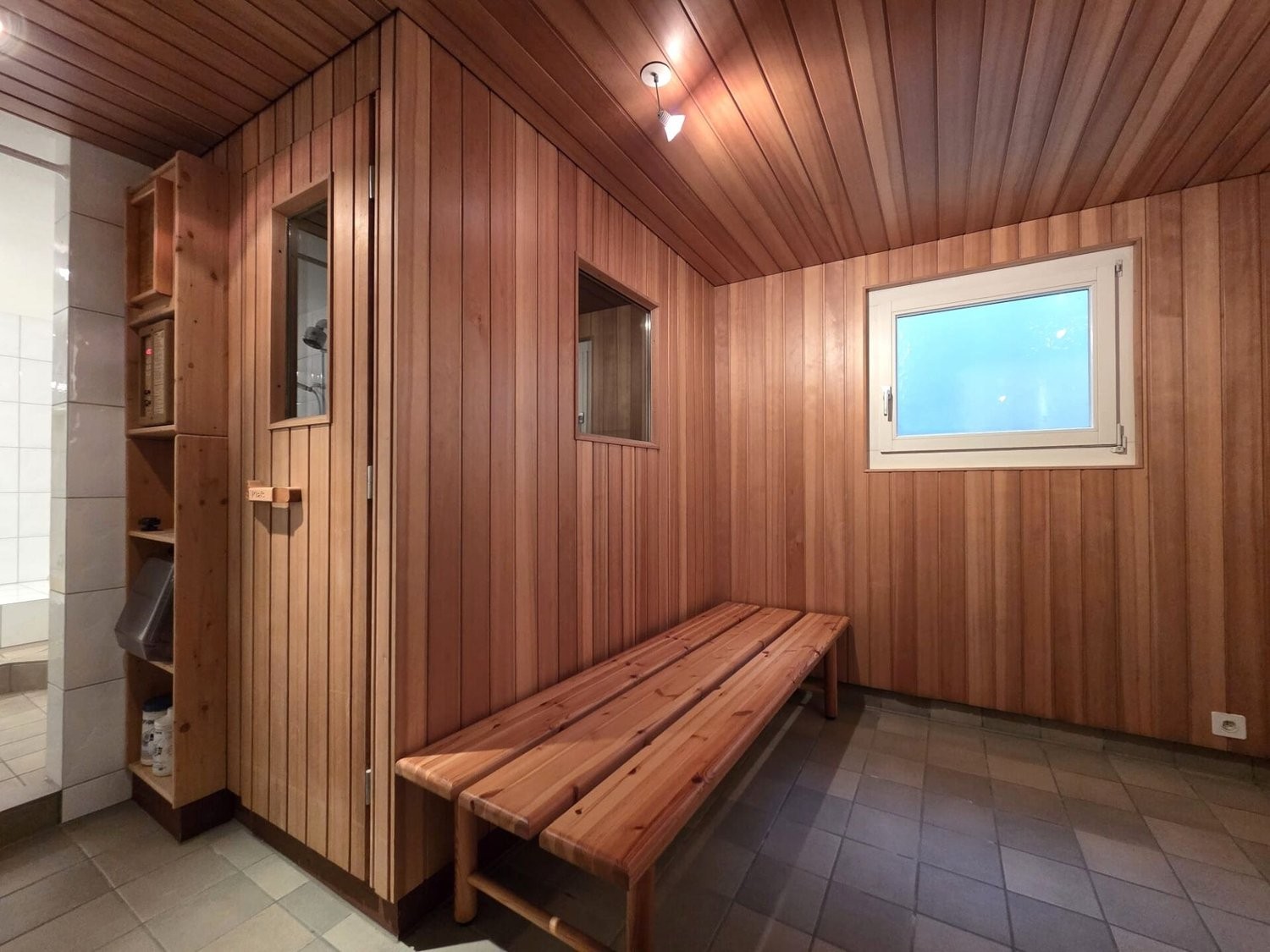 Spa-Bereich mit Sauna, Platz für Liegestühle, Whirlpool, Dusche und Kaltwasserbecken (Cold Plunge)