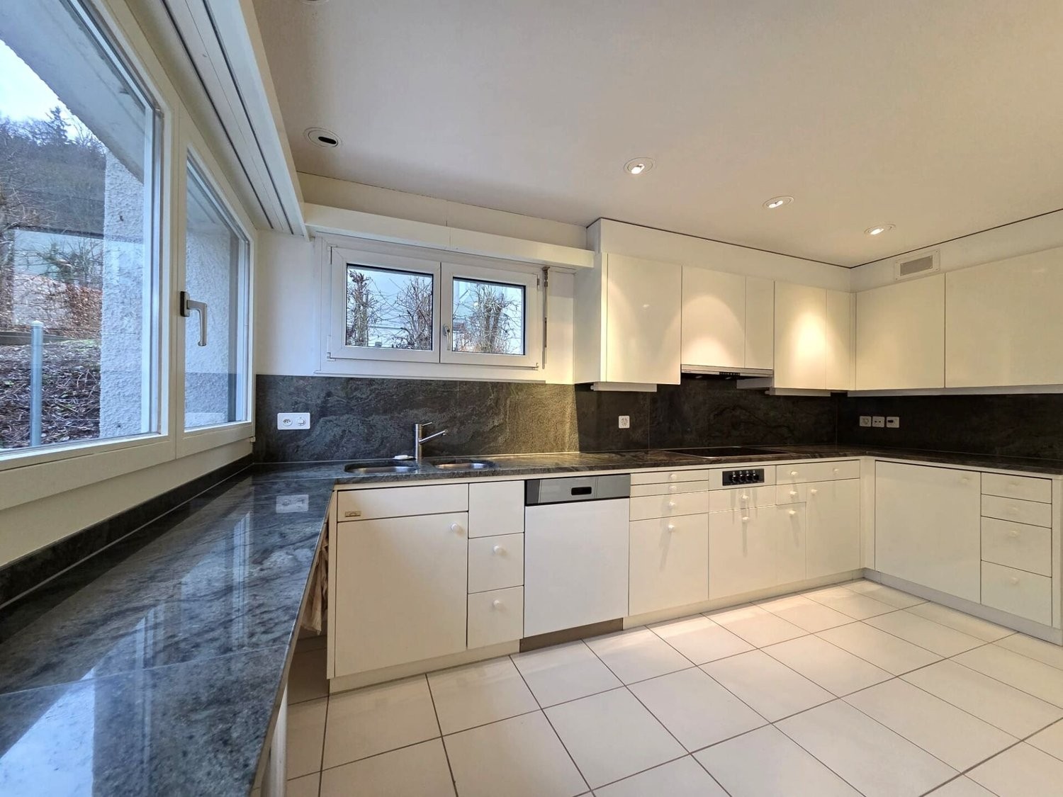 Grosse, helle Küche mit charmanter Frühstücksbar und Blick in den Garten