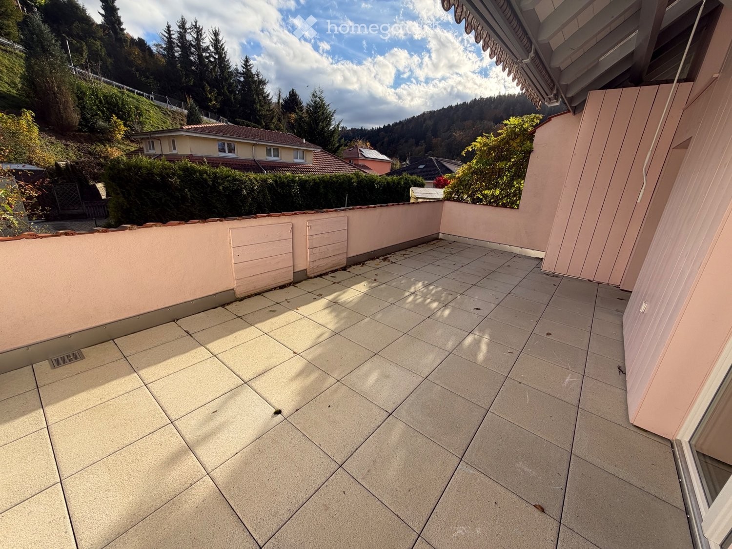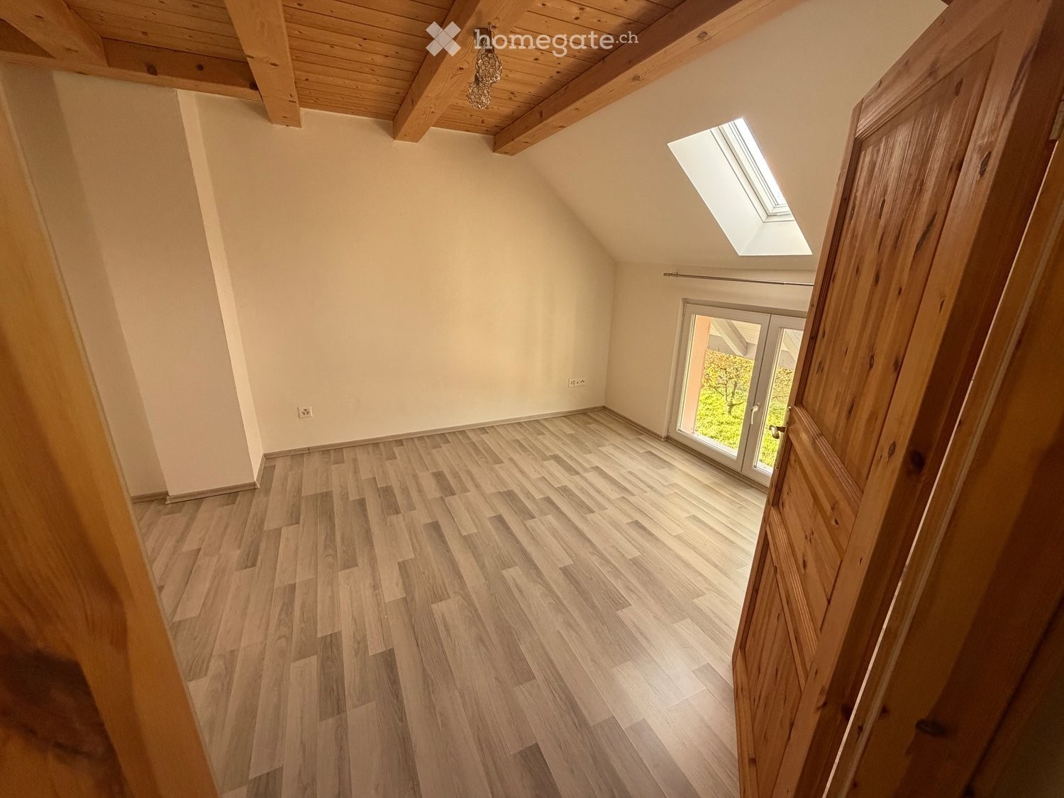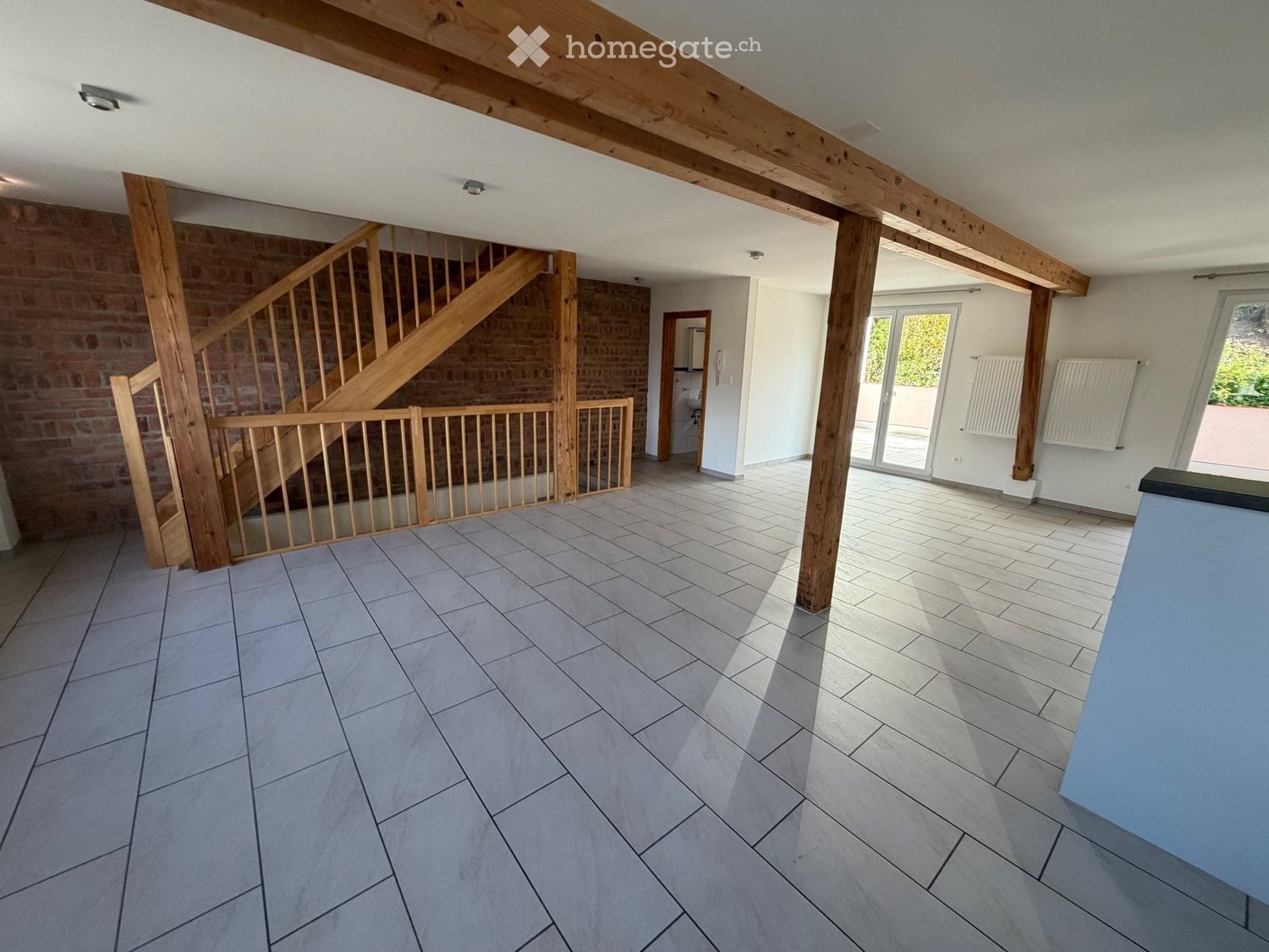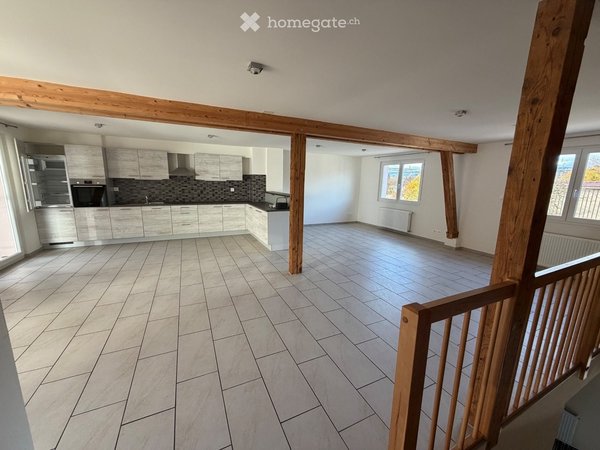 Durch eine Breite Treppe kommt man zur zweiten Etage in einen hellen Wohnbereich. Hier befindet sich ein offener Bereich, der Küche und Wohnzimmer verbindet, Zwei grosse Terassentüren führen von der Küche nach draussen.. Dazu hat es auch ein Gäste WC..