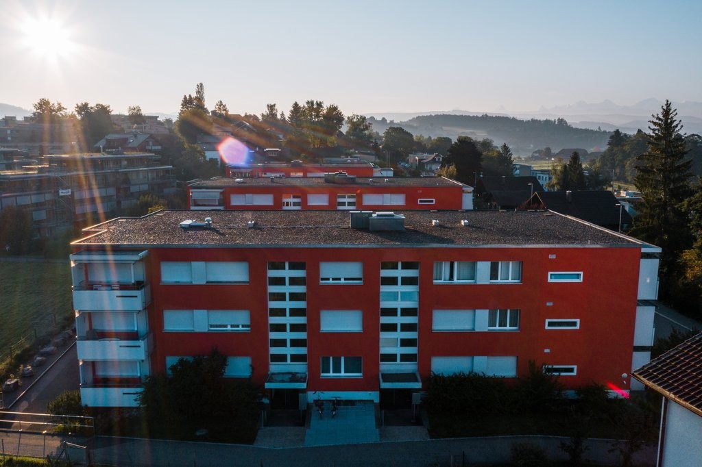 Die Liegenschaft befindet sich ein paar Fussminuten entfernt von Einkauf und ÖV und grenzt an Landwirtschaftsland. Vom Esszimmer aus geniesst man einen herrlichen Blick über Wiesen zum nahe gelegenen Wald.