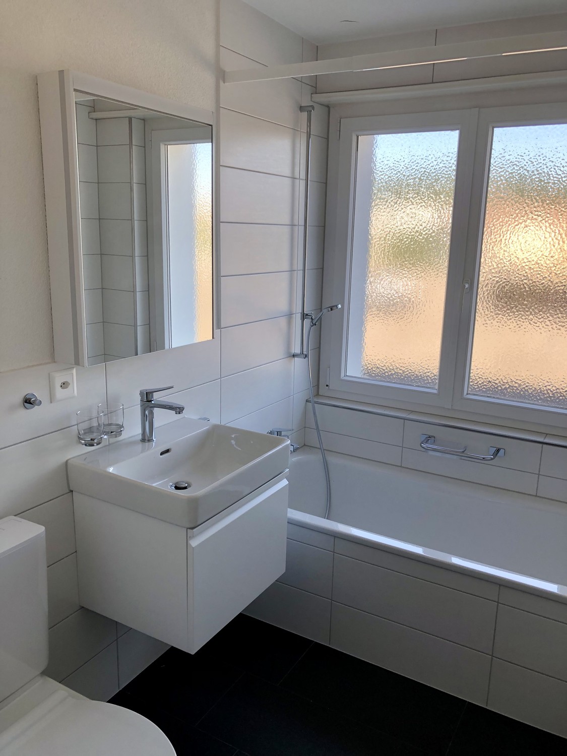 · Badezimmer: Ein modernes Badezimmer mit WC, Badewanne und Fenster