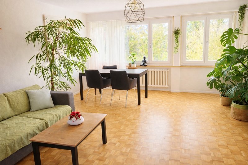 · 2 gemütliche Zimmer: Mit Holzfussboden und grossen Fenstern.