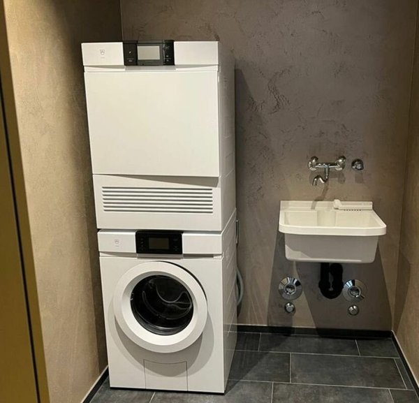 Eigener Waschraum in der Wohnung mit Ausgussbecken und Waschvollautomat sowie einem Wärmepumpentrockner mit Wärmerückgewinnung.