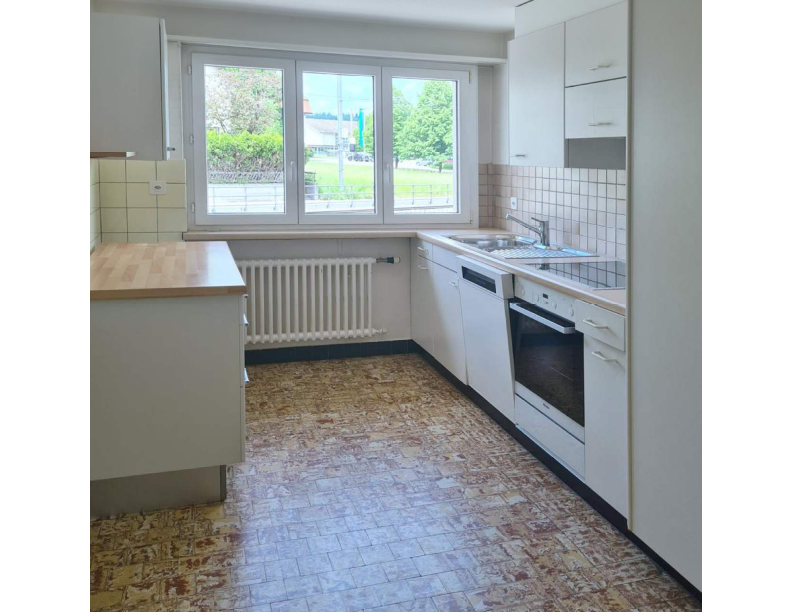 Helle Küche mit Bodenplatten, Glaskeramik, Küchenschränke, in guten Zustand