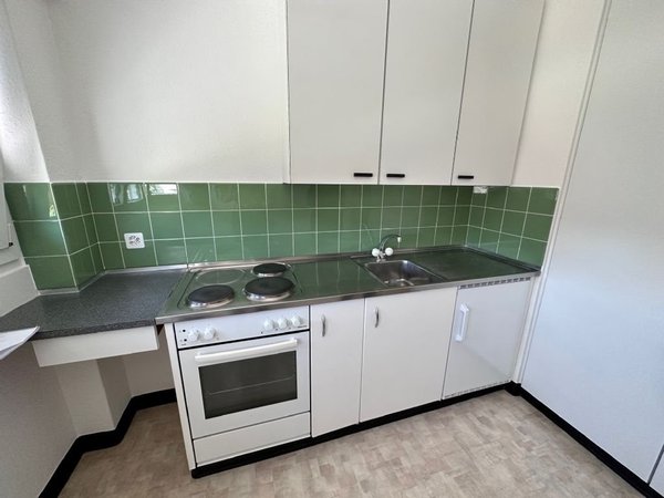 - Küche mit Kochfeld, Backofen und Kühlschrank